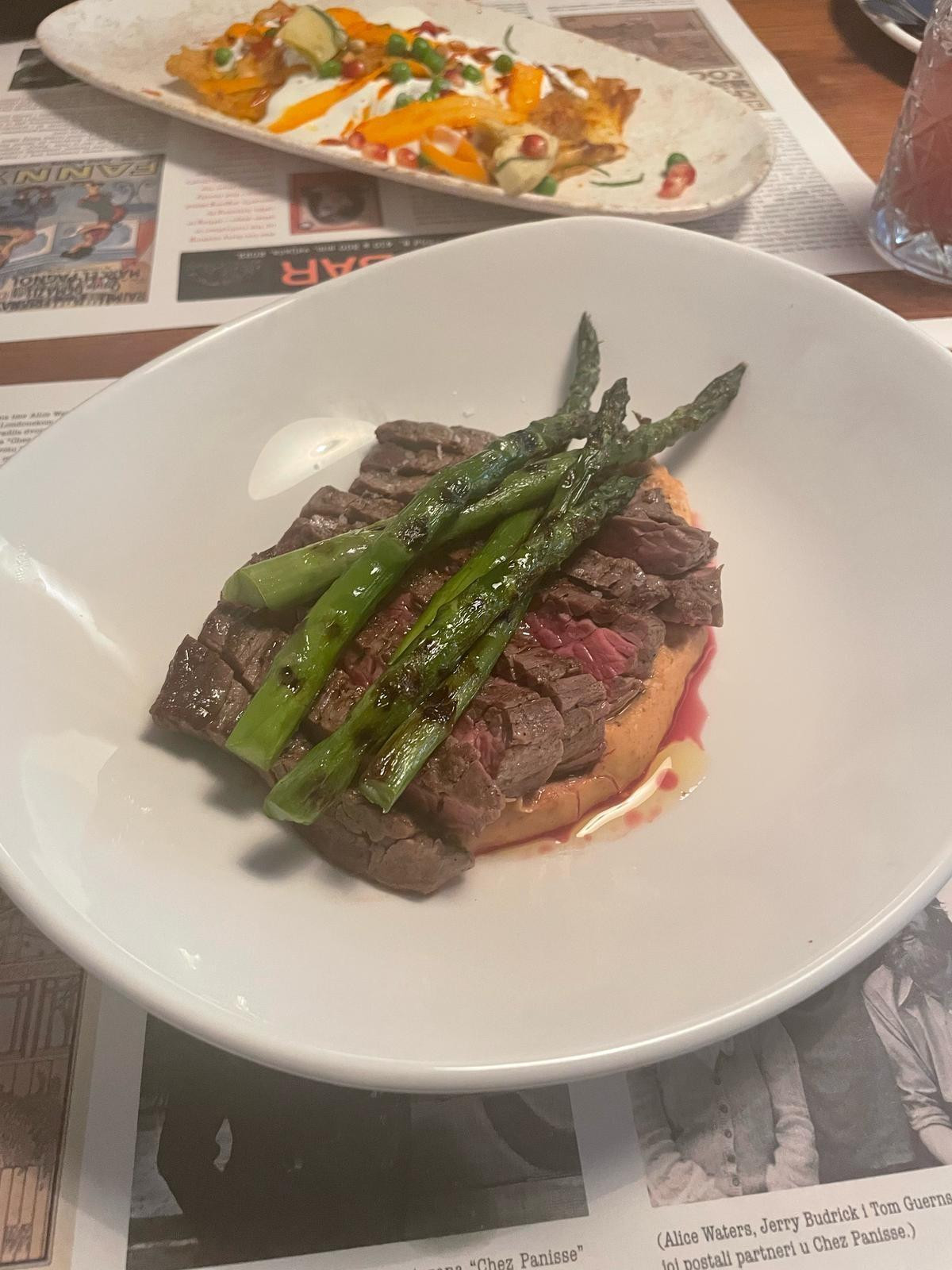 Glavna jela su mjesto gdje Mali Bar zaista zasjaji. Nakon povrtnog početka odlučili smo se za mesnu avanturu. Bavette steak serviran na zanimljivo osmišljenom pireu od kroasana, uz dodatak šparoga s maslacem infuziranim kavom (25 €), bio je tehnički savršeno izveden, što je vrlo pohvalno s obzirom da bavette ne podnosi ni minutu predugo pečenje.