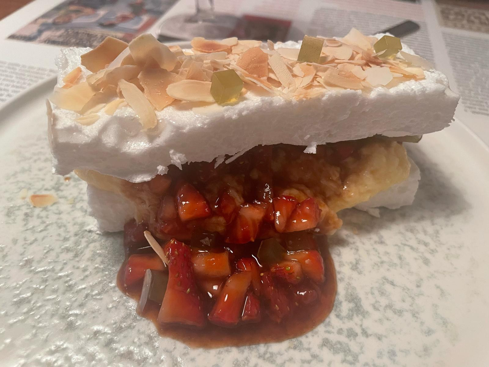 Za desert smo naručili ledeni vjetar s jagodama, acetom od smokava i gelom od smokve, uz tostirane bademe (7 €). Ambicija da se klasika dekonstruktivistički redefinira naišla je na pretjerivanje u šećeru. Smokve, koje su trebale donijeti profinjeni kontrapunkt, bile su gotovo izgubljene pod teškom šećernom konstrukcijom, dok su jagode ipak uspjele bar na trenutak razbiti monotoniju i pružiti potrebnu svježinu. Desert smo završili Ramos Pinto Portom (5,50 €), nenametljivim fortificiranim vinom koje je savršeno pratilo slatkoću kolača.