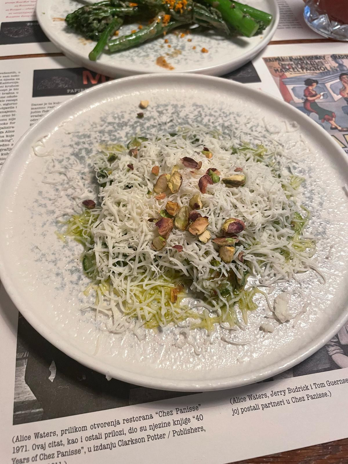 Kulinarski uvod otvorili smo s dvije različite emocije. Grilane ćimule brokule sa sous vide žumanjkom i suyom (10 €) bile su korektno pripremljene, no okus je ipak bio više kuhan nego dimljen. Unatoč al dente teksturi, jelu nedostaje hrabrosti i dubljeg karaktera. Suprotno tome, carpaccio od tikvica prekriven obilnom količinom sira iz mišine i pistacijama (9,50 €) bio je eksplozija okusa koja gotovo prelazi u hedonističko pretjerivanje. Pistacije su zanimljiv detalj, rijedak i pohvalan odmak od već pomalo dosadne kombinacije pistacija i čokolade, ali sir je tu ipak preuzeo glavnu riječ. Malo više svježine i kiseline uravnotežilo bi ovo inače vrlo ukusno jelo.