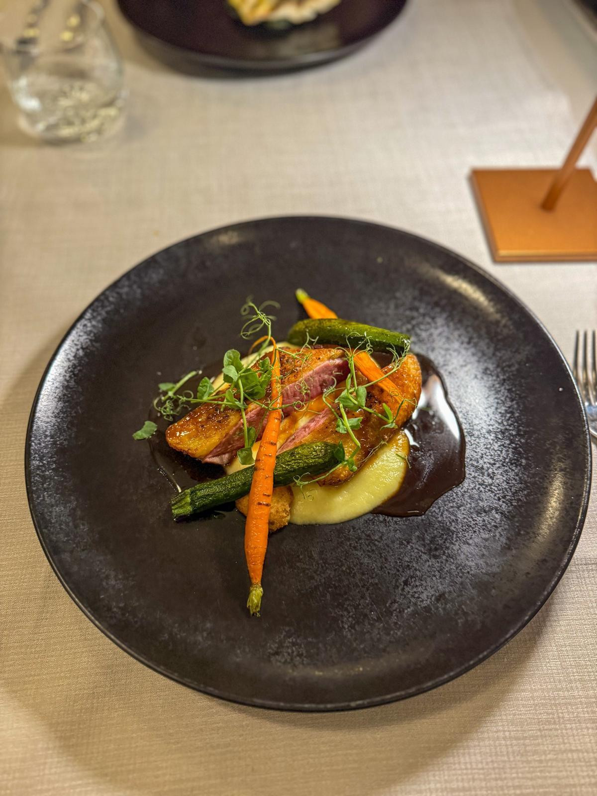 Čak i jelo koje bismo proglasili najboljim te večeri, pačja prsa na kremi od jabuke i maraške (28 €), nije prošlo bez tehničkih manjkavosti. Iako su prsa bila puna okusa, stigla su na stol osjetno manje pečena od traženog medium rare. No, pravi pokazatelj nekonzistentnosti kuhinje bio je prilog. Mrkve su bile potpuno sirove, ne al dente, već termički neobrađene, kao da su tek ovlaš dotaknule grill. S druge strane, tikvice su bile meke i ukusne, što samo postavlja pitanje kako je takav propust s mrkvom moguć. Za kraj, krema od jabuke i maraške bila je prilično rijetka te je više podsjećala na vodenasti umak nego na podlogu koja bi trebala povezati komponente jela.
