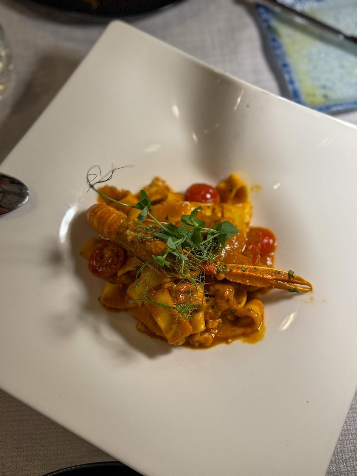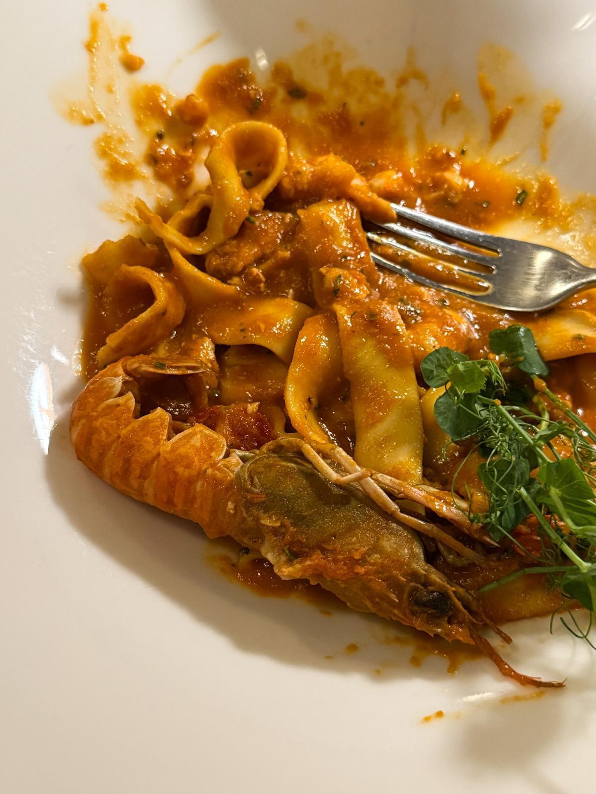 S toplim predjelom dojam se donekle popravio, ali ne u potpunosti. Domaća pašta s jadranskim škampima (27 €) bila je sama po sebi ukusna; umak je bio bogat, a tjestenina kuhana kako treba. Međutim, upravo je glavna namirnica, škampi, bila problematična na dvije razine. Prvo, oni umiješani u umak bili su osjetno prekuhani, do te mjere da su se raspadali i gubili svaku prepoznatljivu teksturu. Drugo, i znatno ozbiljnije, škamp koji je poslužen kao ukras na vrhu tanjura nije odavao dojam besprijekorne svježine. Njegova glava pokazivala je očite znakove tamnjenja, odnosno melanoze. Riječ je o biokemijskoj reakciji za koju je potrebno da prođe određeno vrijeme od ulova, i jasan je pokazatelj da namirnica nije poslužena na svom vrhuncu.