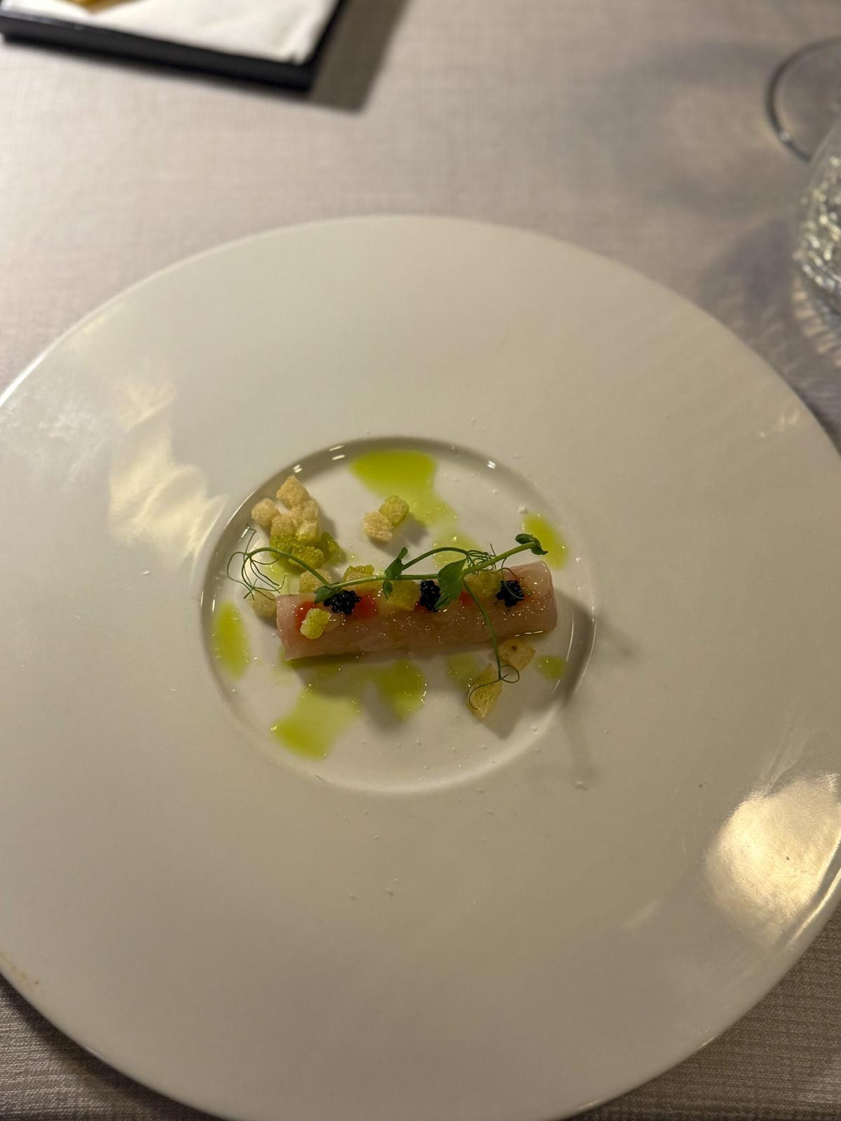 Prvo hladno predjelo, tuna tartar (31 €), najavljeno kao kombinacija motara, wasabija i kavijara, pokazalo se kao sušta suprotnost eleganciji koju obećava. Umjesto skladnosti, na tanjuru nas je dočekao kaos okusa. No, pravi promašaj ležao je u samoj obradi tune. Tekstura je nepogrešivo odala da je meso obrađeno blenderom, a ne strpljivo sjeckano ili strugano. Taj jeftini prečac, koji u smjesu unosi žilave komadiće vezivnog tkiva, velik je nemar za jelo koje pretendira na visoku kuhinju i naplaćuje se po toj cijeni. Kao da to nije bilo dovoljno, jelo je dokrajčila još jedna tehnička pogreška. Čini se da u kuhinji postoji ozbiljan problem s osnovama, jer je količina grubo i neravnomjerno nasjeckanog luka bila tolika da je njegova sirova agresivnost u potpunosti poništila ostale komponente jela.