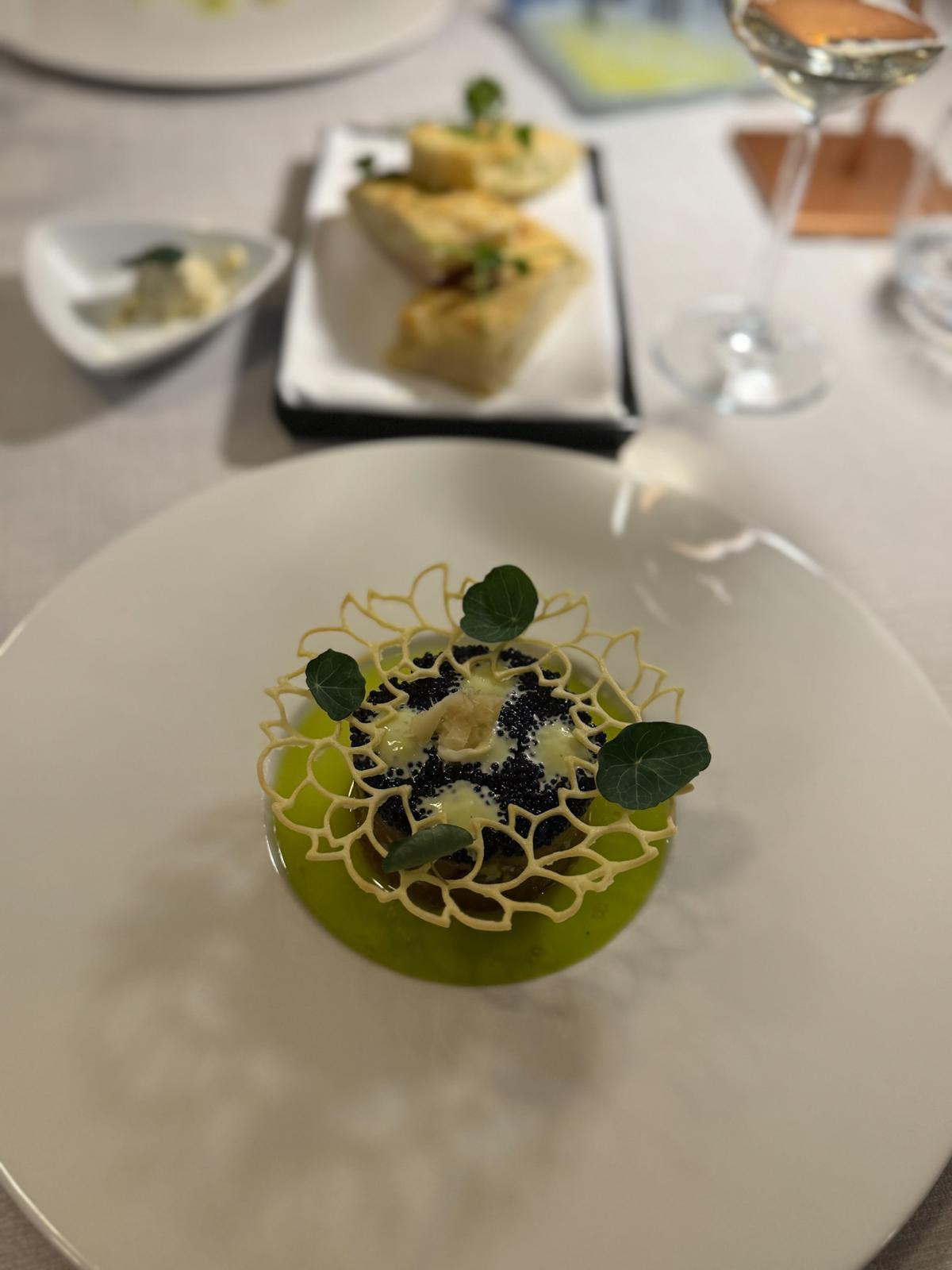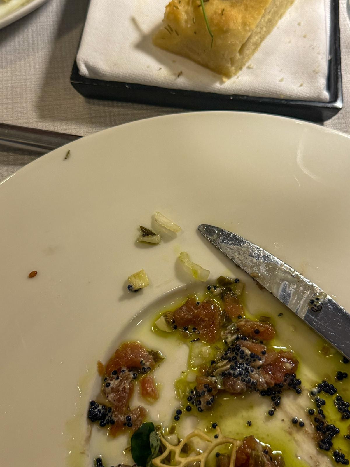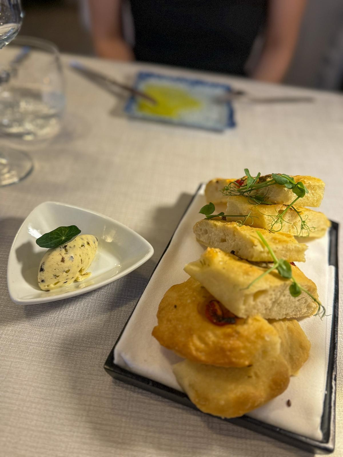 Prije samih hladnih predjela na stol je stigao pozdrav iz kuhinje. Domaća focaccia i maslac aromatiziran crnim tartufima. Focaccia je bila obogaćena ružmarinom i cherry rajčicama te je bila mekana. No, njezina se aromatičnost potpuno kosila s bogatim maslacem. Da stvar bude gora, tijekom kušanja pozdrava konobari su nam donijeli hladna predjela, prekinuvši nas u zalogajima te pomičući tanjure na kojima nam se nalazio kruh s maslacem.