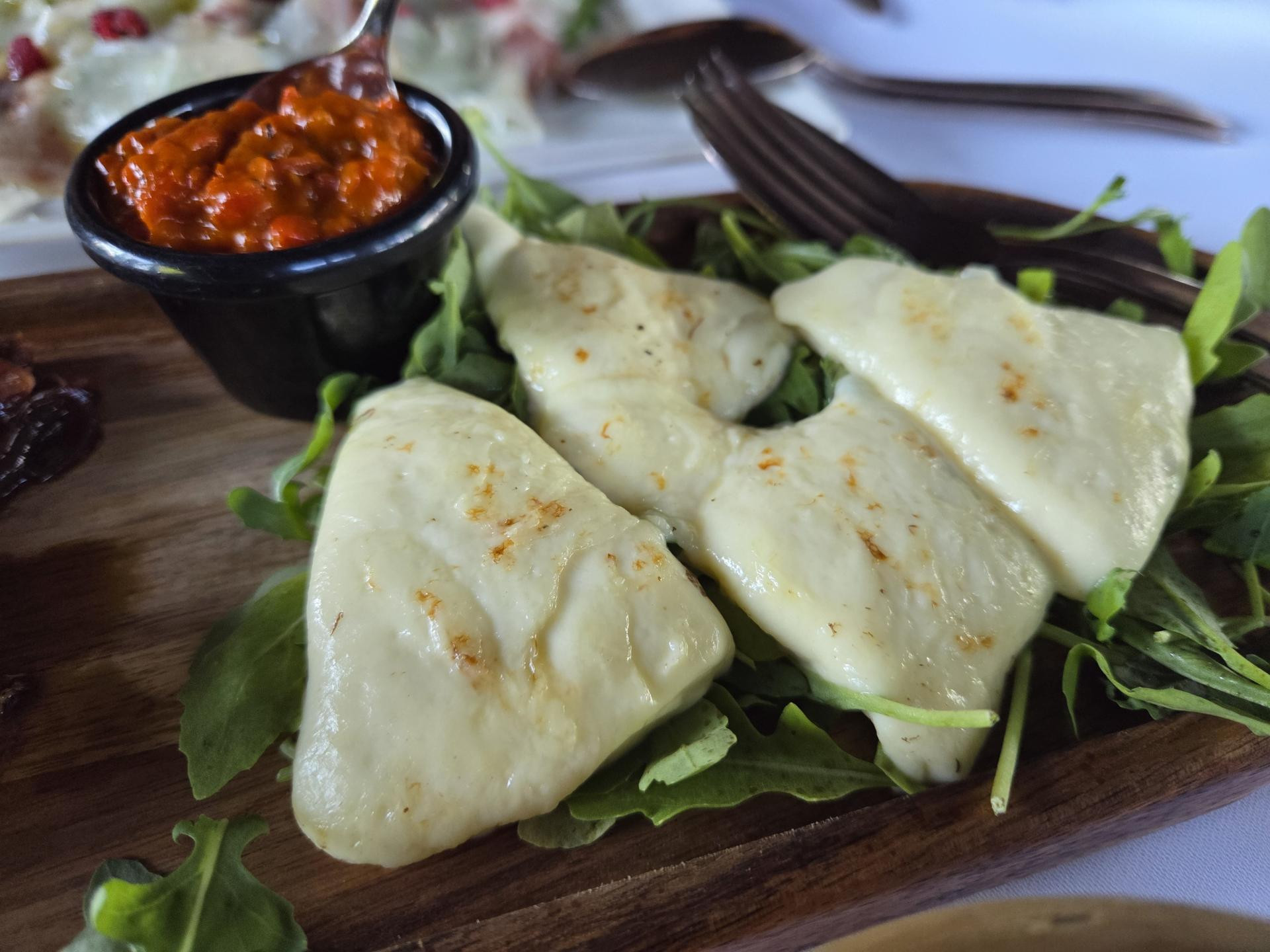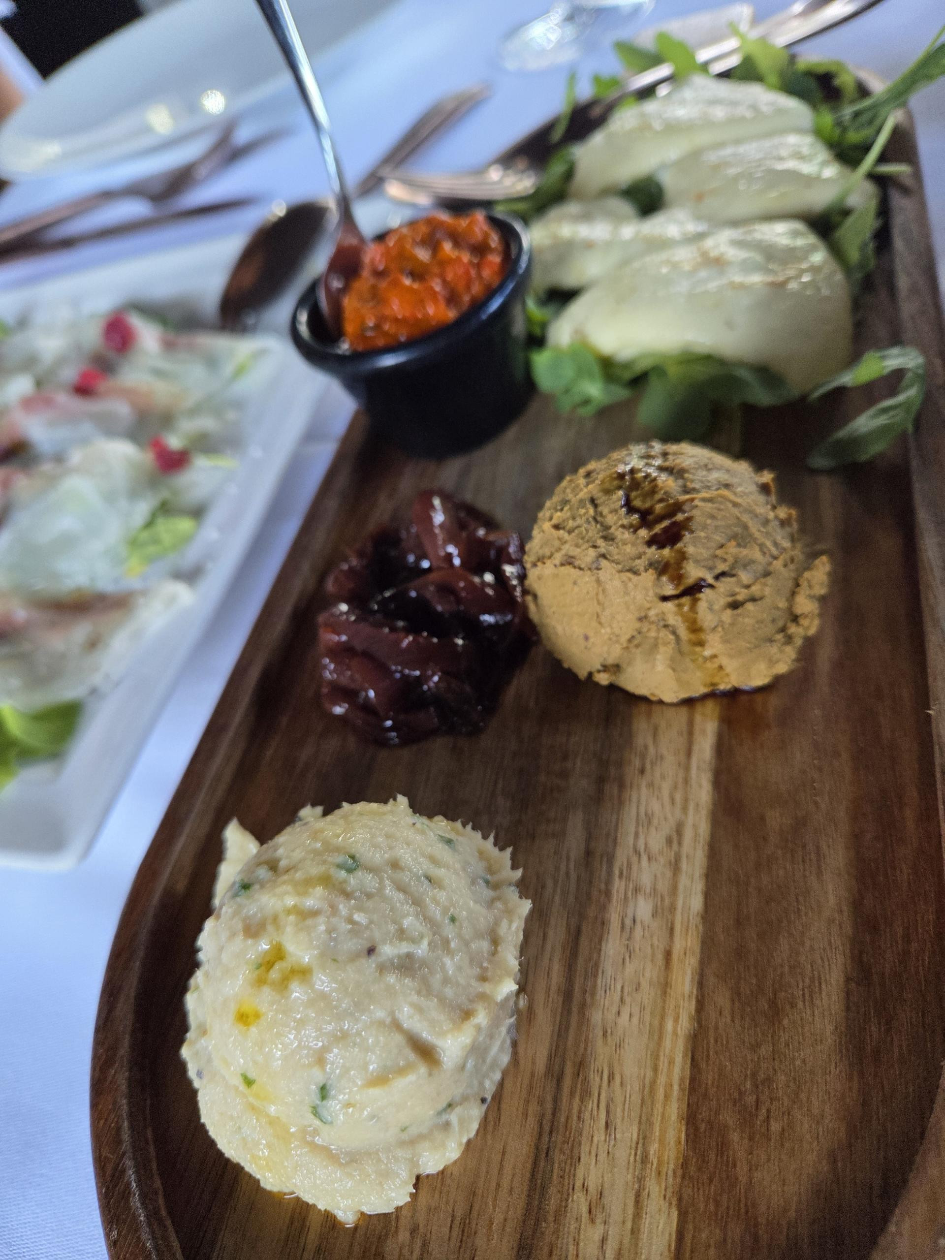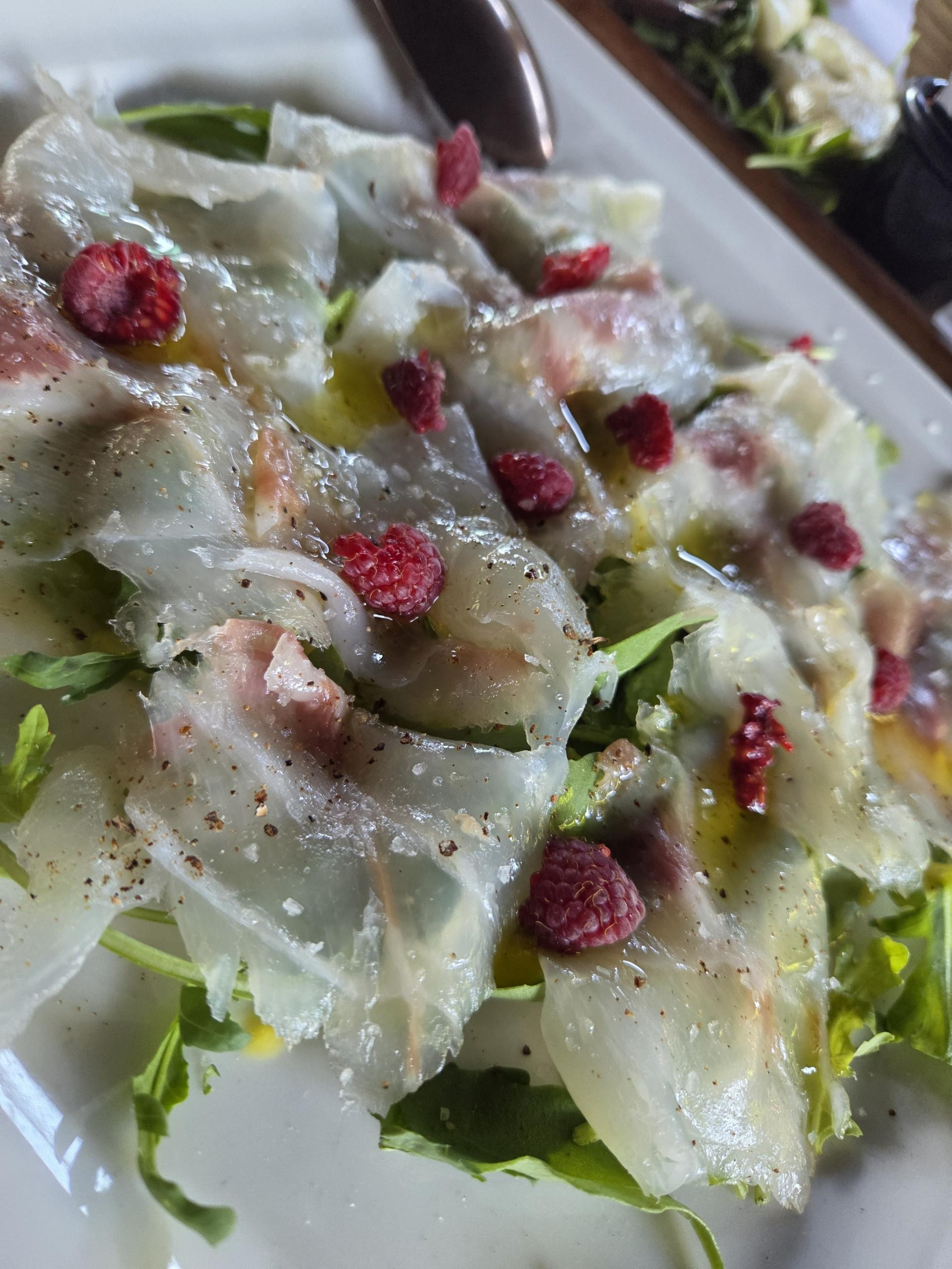 Krećemo s carpacciom od brancina, posluženog na rikoli, s malinama, a s druge strane kombiniramo riblju i guščju paštetu koje dolaze s malo ajvara, chutneya i dodajemo pečeni škripavac. Domaći kruh sjajna je podloga prilično žestokoj, ali ukusnoj ribljoj pašteti, a jednako je moćna kombinacija kremaste paštete s chutneyem. Škripavac dolazi na neveseloj rikoli (jednako kao brancin) i sam za sebe izgleda malo otužno, ali dobar je par ostatku na daščici. Ne baš sasvim svježa rikola podloga je brancinu koji je začinjen prekiselim dresingom, a neravnoteži pridonose i nepotrebne maline, pa sve skupa ispada potpuno izvan balansa. U neoznačenoj bočicici nalazilo se (vjerojatno) domaće maslinovo ulje kakvom se ovdje ne bismo nadali; srećom, ulje Grozić, koje je također bilo na stolu, spasilo je stvar.