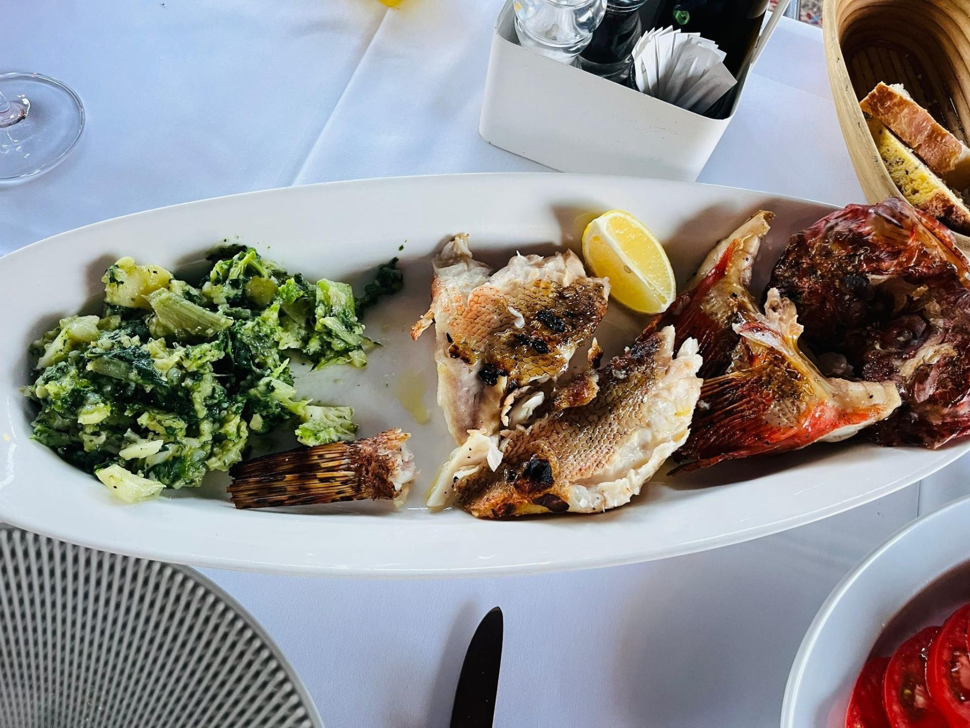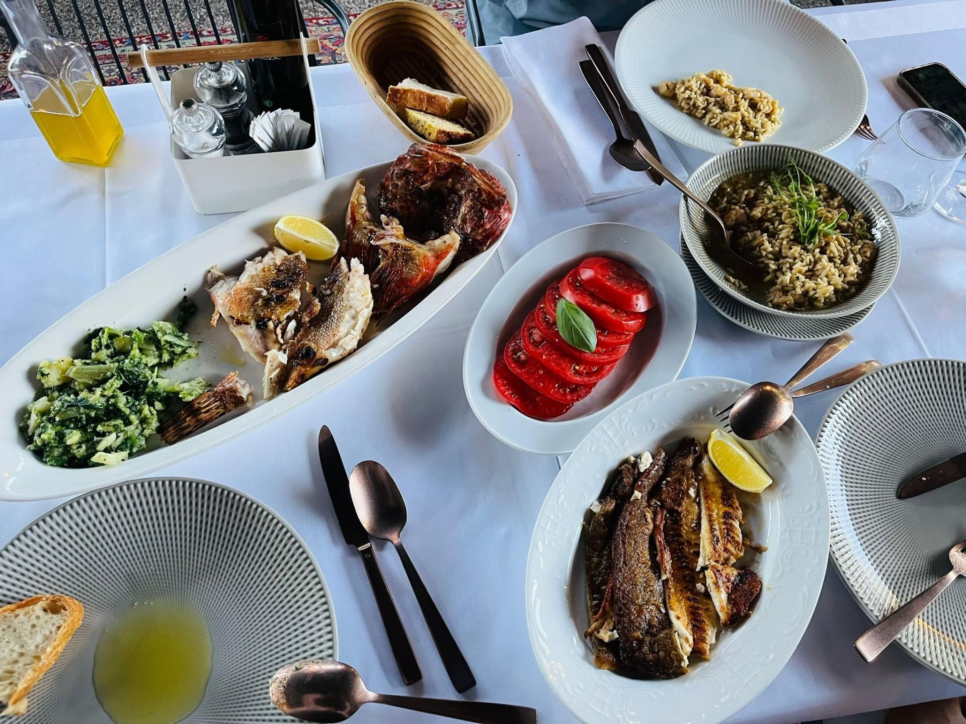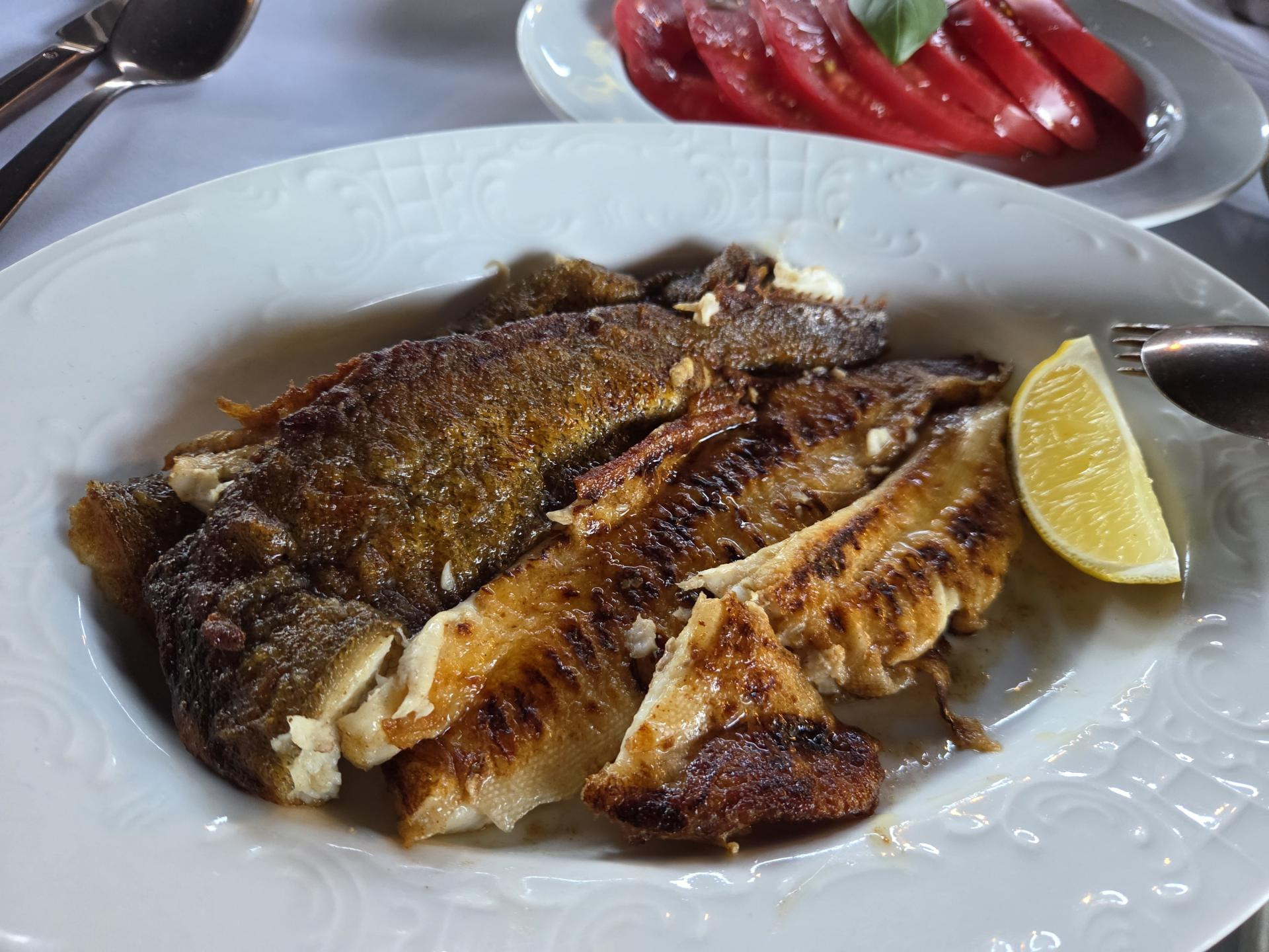 Odlučujemo dalje morski, i nakon pogleda u vitrinu odabiremo jednu škarpinu i jednu ribu list, te rižoto od kozica. Kako nam konobar tvrdi da će nam to sve biti previše, skromno za prilog odabiremo samo domaću rajčicu. Riba koja dolazi savršeno je pripremljena, list slasan na putru, a škarpina s roštilja. Obje ribe su fantastično ukusne i znalački pripremljene, a prilog od blitve jednako je kvalitetan, jednostavan, ali vrhunski.