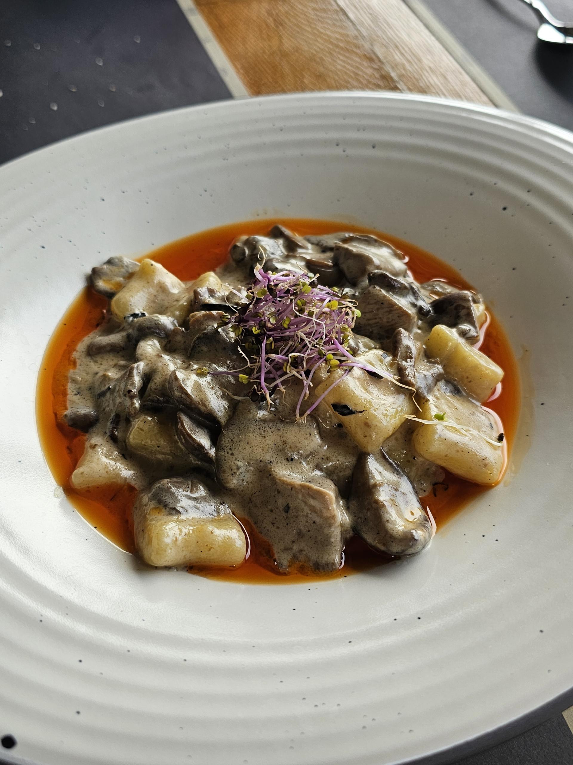 Njoki su tehnički s popisa predjela, ali smo htjeli probati ragu od šumskih gljiva s kojima njoki dolaze. Njoki su domaći i taman, niti pretvrdi niti premekani, a od gljiva su u raguu bile sunčanice i vrganji. Jako ukusno jelo pogodno i za vegetarijance i sve one koji vole šumske gljive, a kao i medvjeđi luk, sve gljive koje koriste u kuhinji sami beru u šumi.