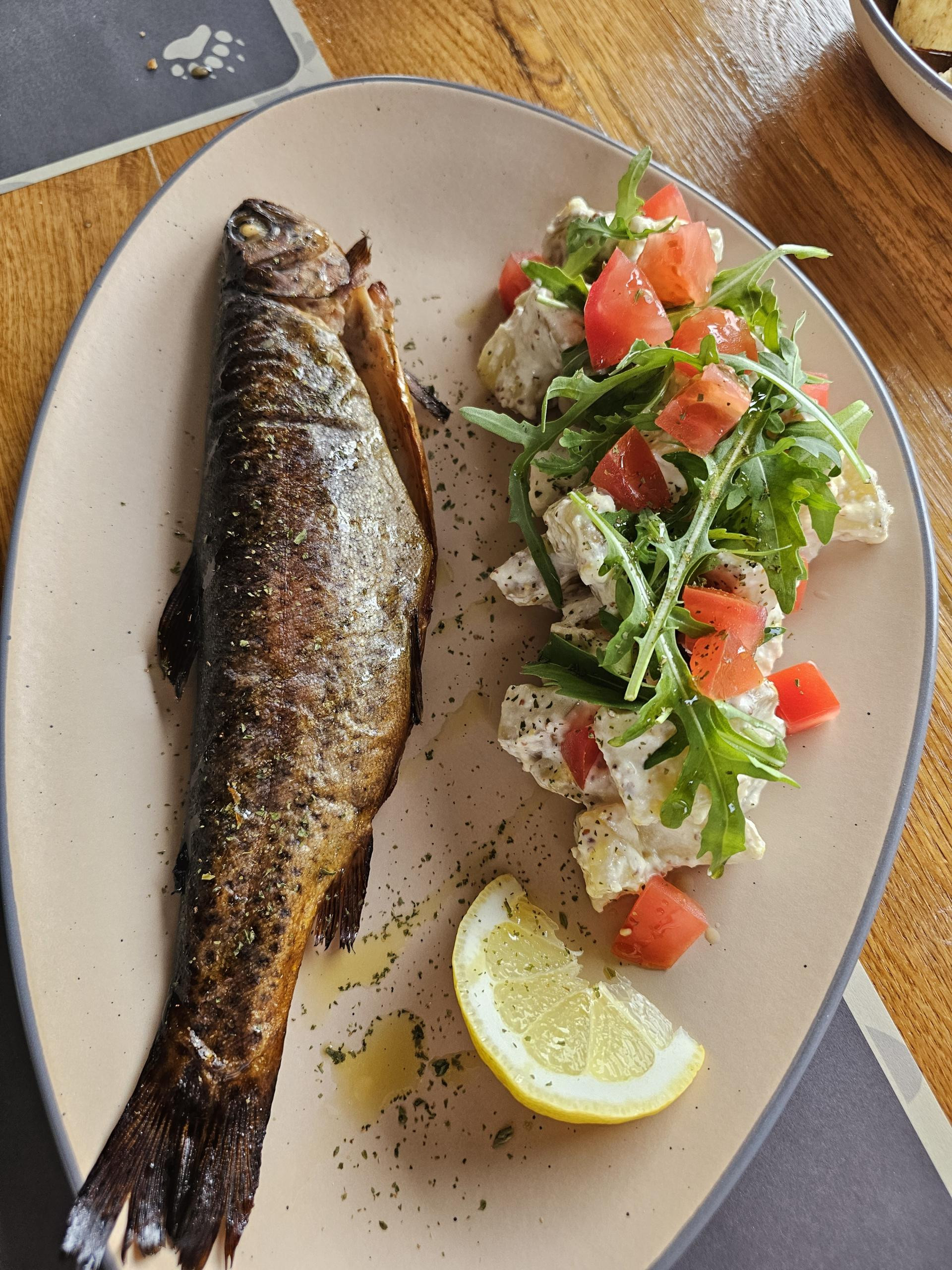 Dimljena pastrva je bila savršena. Idealno dimljena s blagim okusom dima koji nije dominirao, taman pečena i idealno slana (zahvaljujući marinadi). Definitivno jedna od boljih pastrva koju smo probali. Osim toga, dodatak hrena u krumpir salatu dao je dobrodošao element svježine. Rukola u salati nam načelno nije smetala, ali nam rajčica nikako nije odgovarala, čak ni da je u punoj sezoni. Ali to je stvarno sitna zamjerka u odnosu na glavnu zvijezdu tanjura.