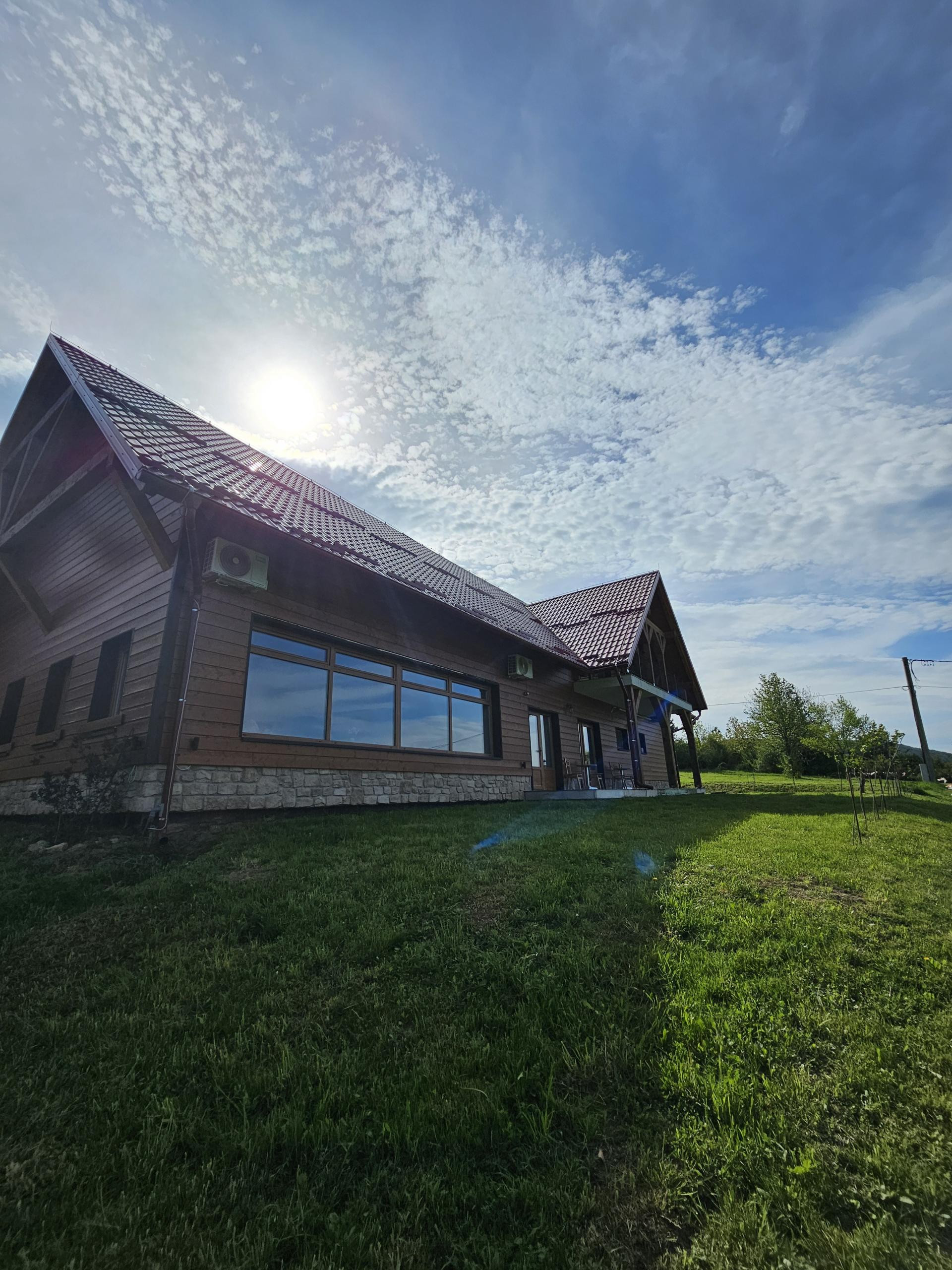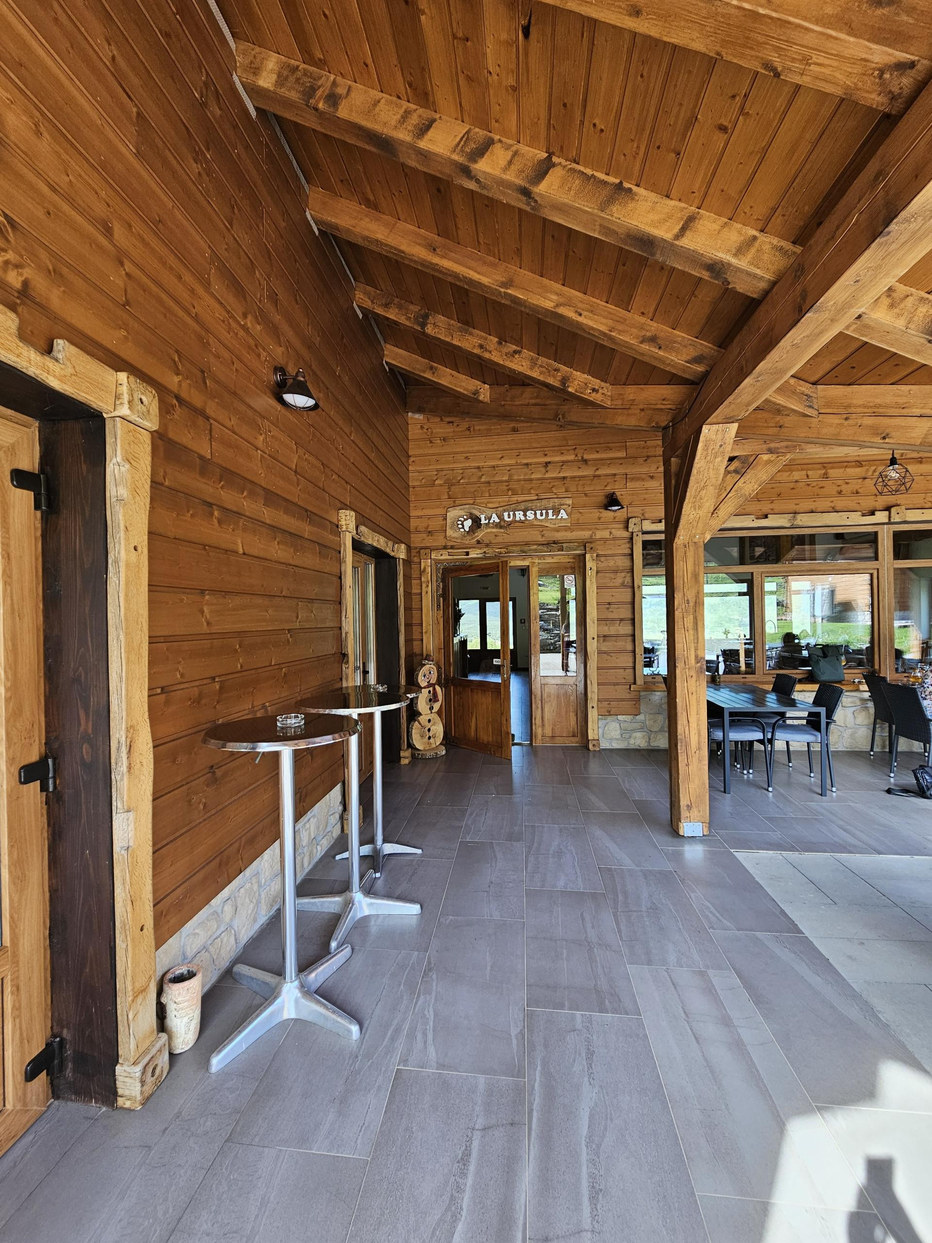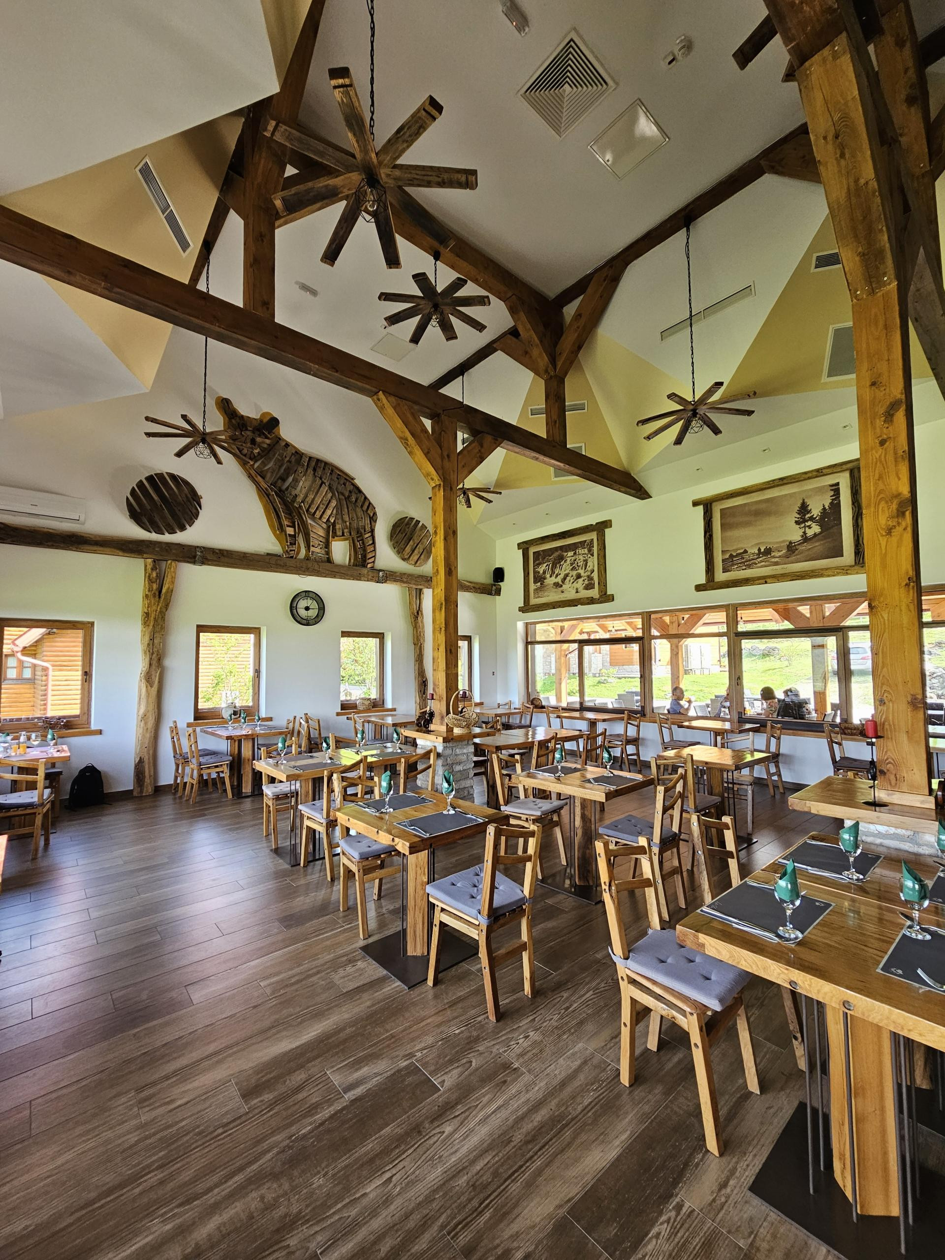 Uređenje je modernizirana verzija planinske arhitekture s naglaskom na drvetu i kosim krovovima, a iako se s južne strane nalazi prostrana terasa s pogledom na bungalove i šumu, nas je apsolutno osvojio pogled na iz velike dvorane koja gleda na pašnjake s kravama i Plješivicu. Iako je relativno blizu Cesti, vani vlada apsolutan mir i tišina, tako da je doista teško odlučiti se gdje sjesti.