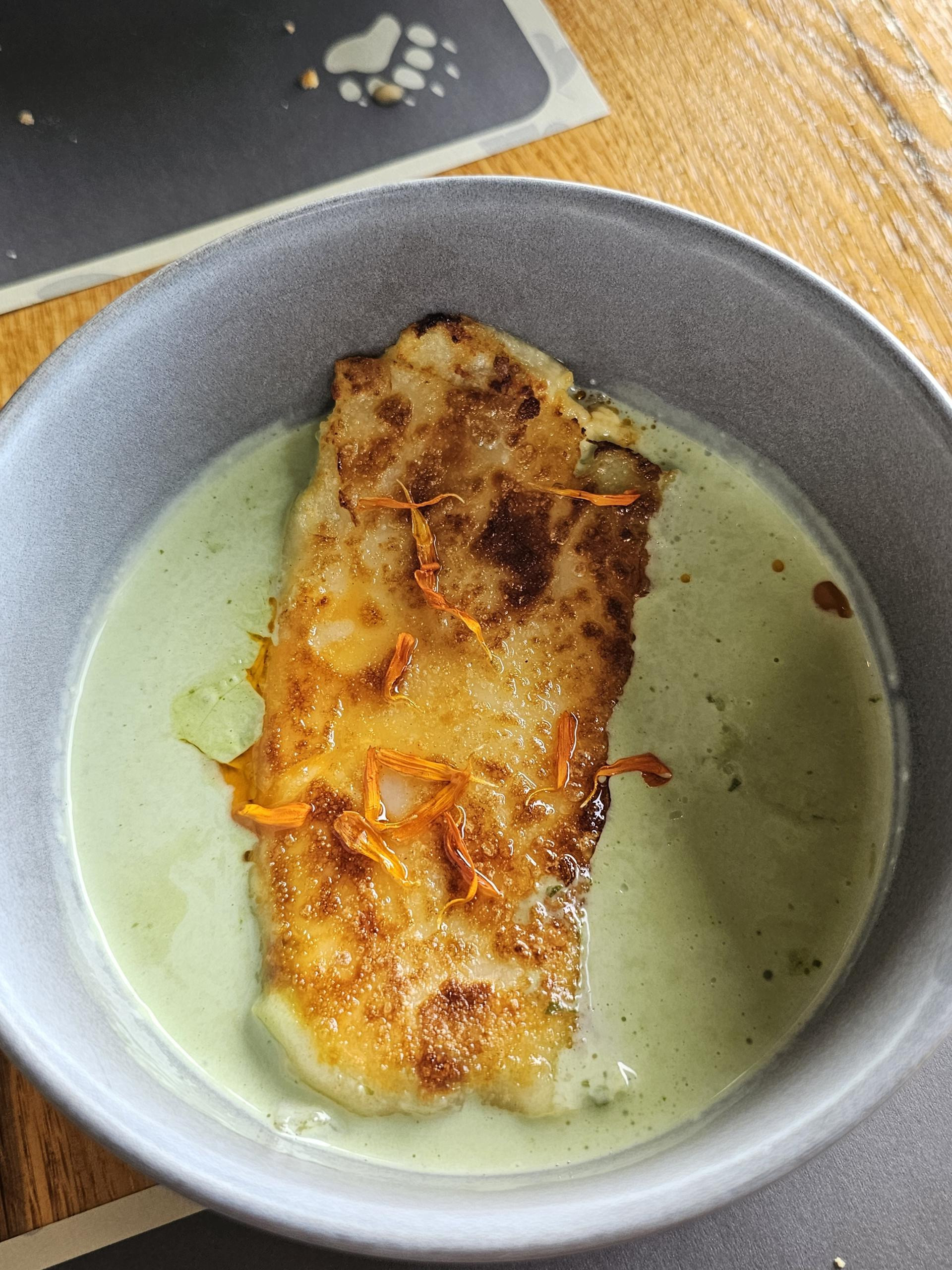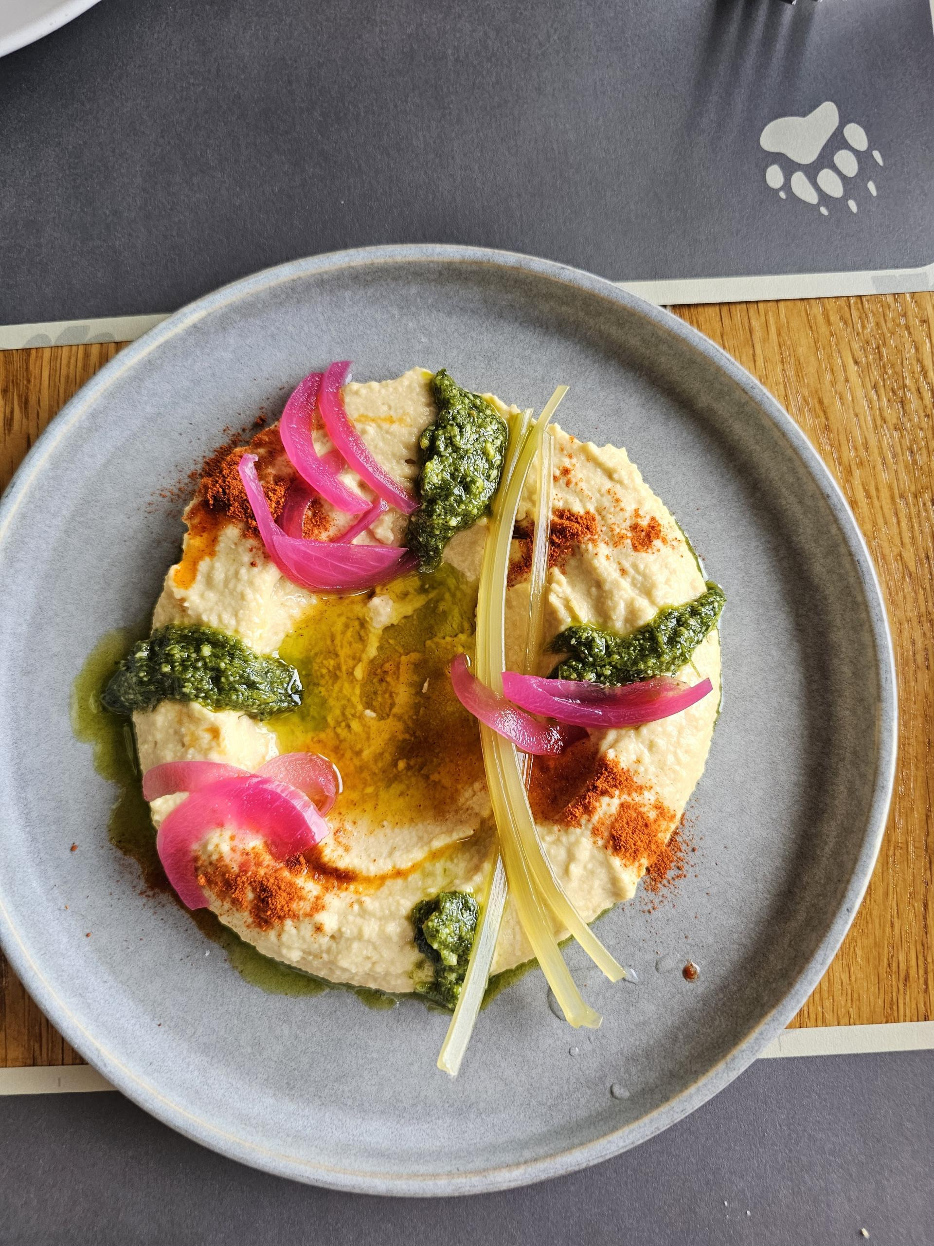 Kao što je i za očekivati, kruh rade sami, a ovdje se radilo o varijanti focaccie, koja je bila ukusna i nije bila premasna, tako da je bila idealna za hummus. Hummus rade sami i vrlo je dobar, no ono što ga čini vrijednim preporuke je dodatak ukiseljenih stabljika medvjeđeg luka, ukiseljenog luka i pesta od medvjeđeg luka. Luk i medvjeđi luk su gotovo savršeno ukiseljeni s vrlo dobro balansiranom kiselinom i slatkoćom, a pesto je davao idealnu dozu blage oštrine medvjeđeg luka. Iako je maslinovo ulje vrlo dobro funkcioniralo, bučino, hladno prešano suncokretovo ili koje drugo aromatično biljno ulje bilo bi dobrodošao izlet u nekonvencionalno, a opet okusno funkcionalno.