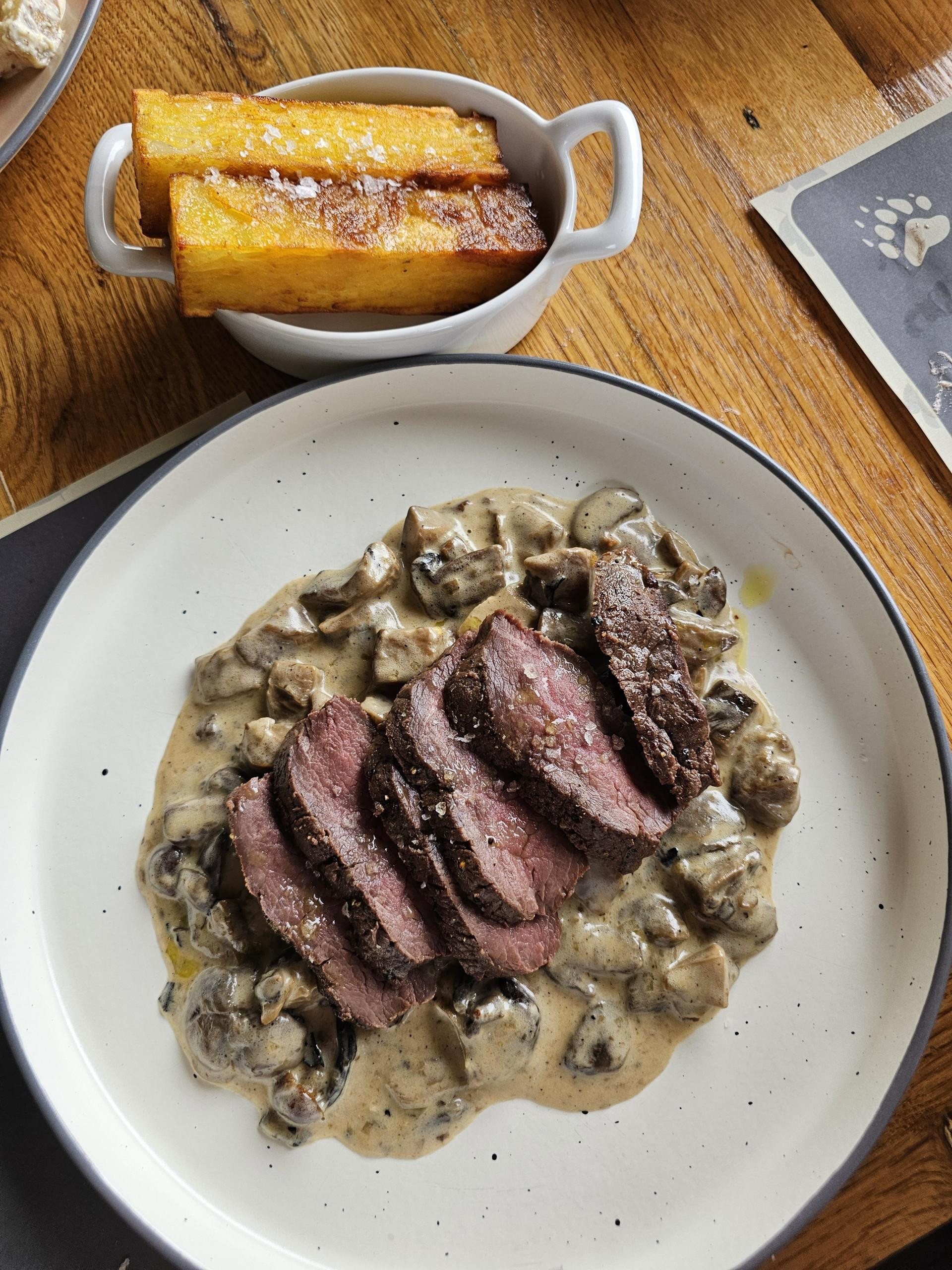 Jelenski odrezak je također izvrstan! Idealno pečen, mekan i sočan, poslužen na raguu od šumskih gljiva, uz prilog od krumpira pave. Ragu od gljiva je isti kao i kod njoka, ali to ne smatramo problemom, a krumpir pave je jedan od priloga kojeg uvijek naručujemo u restoranima jer u kućnim uvjetima pomalo ga je gnjavaža raditi, ali velik užitak jesti. Ovdje je bio dosta dobar, možda malo previše mastan. U svako slučaju tanjur u kojem je šuma opet imala glavno mjesto i na kojem su njeni plodovi predstavljeni u izvrsnom izdanju.
