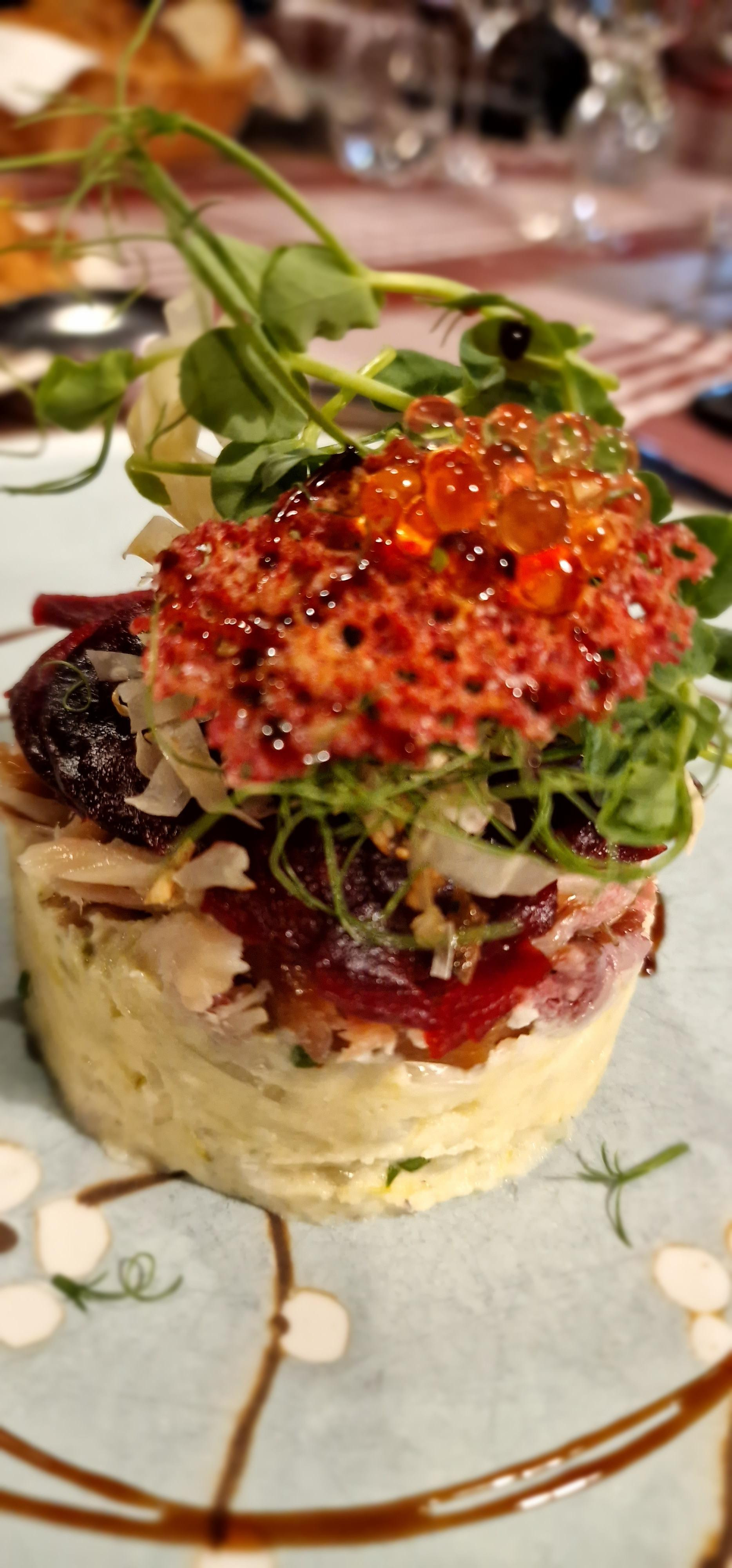 Slijedila je marinirana dimljena riječna riba - konkretno tostolobik - poslužena na podlozi od krumpir salate i cikle. Vizualno, jelo oduševljava: zapečeni listić parmezana s vrhom od pastrvine ikre zaigrano nadvisuje bogate slojeve. Iznutra, okus je još dojmljiviji. Dimljeni filet je čist, bez zamućenih aroma mulja, a spoj s ciklom i laganom salatom stvara skladan, slojevit zalogaj. Ovo je hladno predjelo koje nadilazi konvenciju i ostaje u pamćenju.