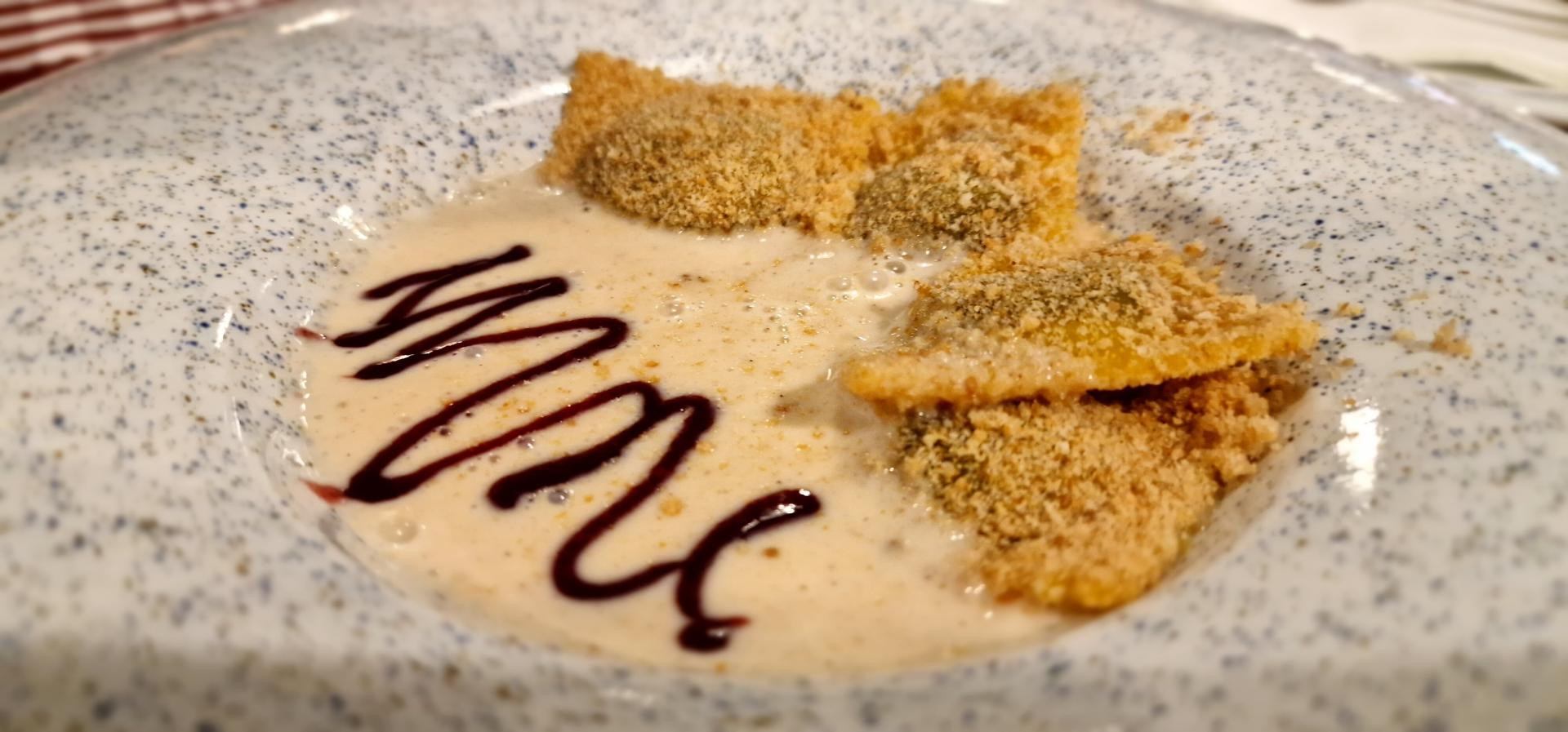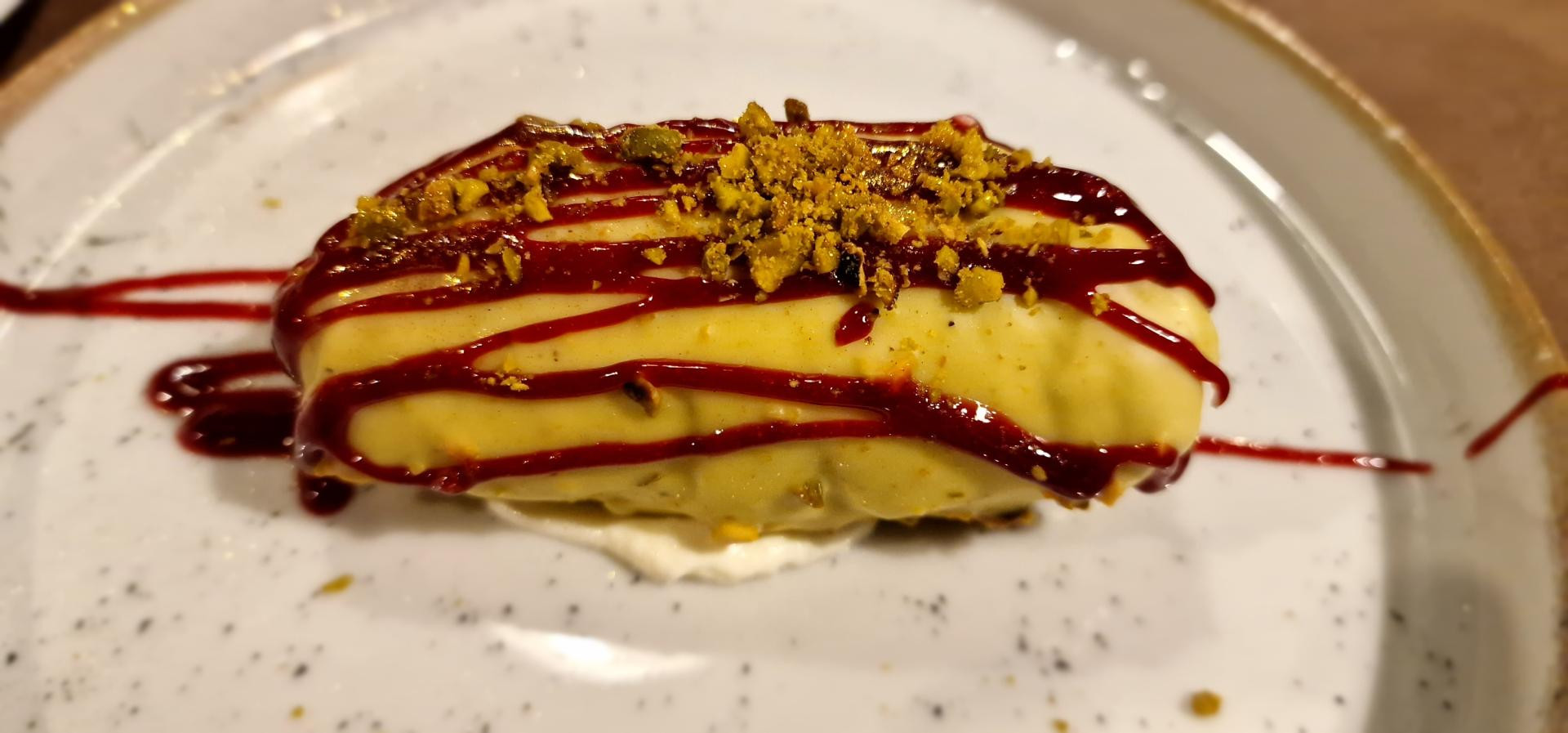 Od deserta, odabrali smo dvije opcije: taške s pekmezom od šljive i pistacio s malinom. Taške su bile upravo ono što očekujete od domaće slastice - bogato punjene, savršeno kuhane, uvaljane u maslac i prezle. Poslužene su s finim umakom od vanilije i ukrasom od coulis preljeva koji daje dodatnu svježinu. Radi se o nostalgičnom jelu kakvog su nekada pravile naše bake u istočnom dijelu Slavonije kao glavno jelo za ručak, ali s dorađenim prezentacijskim dodirom.