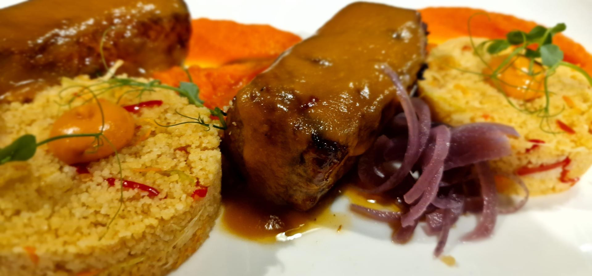 Uz to, poslužene su komponente poput cous-cousa s finim komadićima paprike, pirea od mrkve, julienne povrća i bogatog umaka crnog vina. Tanjur odiše bojama i mirisima, a svaki element ima svoje mjesto i smisao. Ovo je jelo s karakterom koje traži pažnju, ali i nagrađuje nepce kompleksnim slojevima okusa.