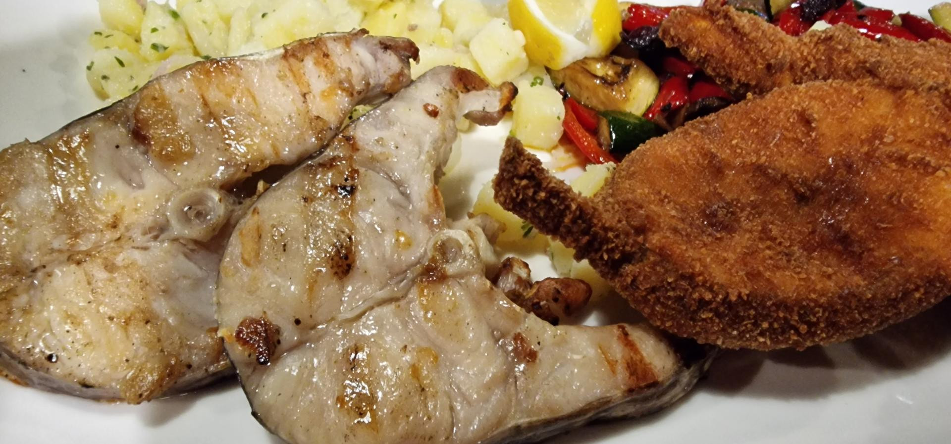 Na ribljem tanjuru našli su se pržene potkove soma i file smuđa. Smuđ je bio pravilno termički obrađen, s hrskavom koricom i sočnim središtem, dok se kod soma ipak osjetio karakterističan miris riječne ribe koji nije bio u potpunosti eliminiran. Prilozi poput domaćeg krumpira s peršinom i dinstanog povrća zaokružuju jelo u klasičnom, ali čvrsto postavljenom okviru.