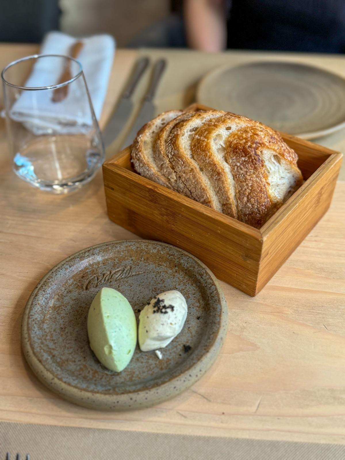 Prije samih predjela stigao je pozdrav iz kuhinje: domaći sourdough kruh poslužen uz kajmak s medvjeđim lukom i maslacem s inćunima i maslinama. Kruh je bio izvanredan, perfektan balans kiselosti, slanoće i teksture. Maslac i kajmak bili su vrlo efektni, puni okusa, no na stol su stigli malčice prehladni te smo ih teško mazali.