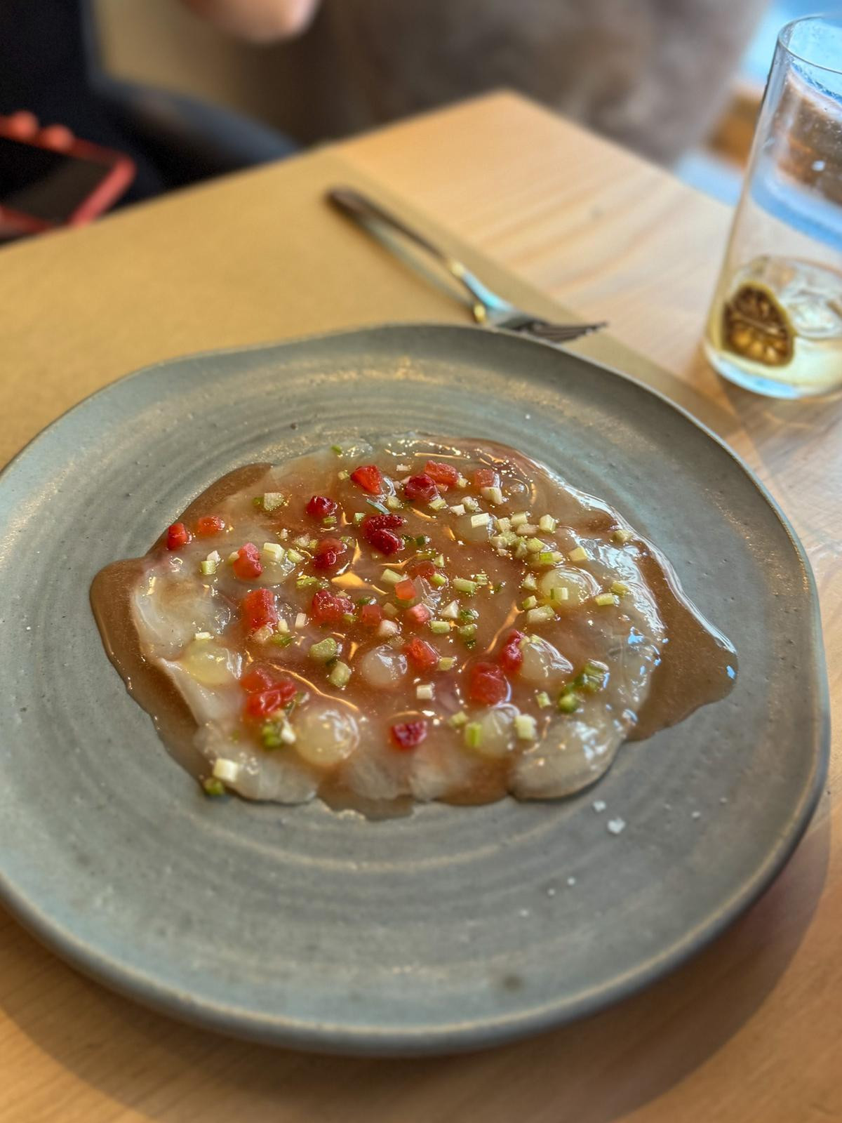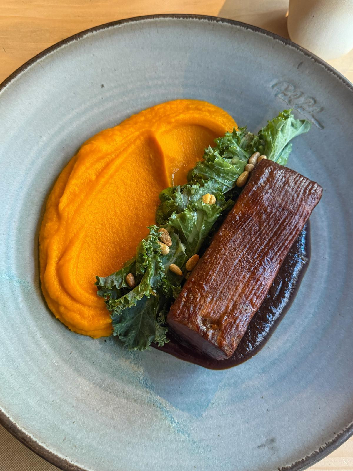 Goveđi tartar (19,80 €), obogaćen dimljenom koštanom srži, kimchijem, čilijem i malenim, ali bogatim prepeličjim jajem, dobra je interpretacija poznatog predjela. Nešto pikantniji, što nam se sviđa, ovo izdanje vječnog klasika vrlo je kremasto. Prepeličje jaje pripomoglo je tome pa se lijepo mazao na tostirano izdanje odličnog sourdougha. Uz tartar smo pili zanimljiv Pinot Crni Drage Režeka.