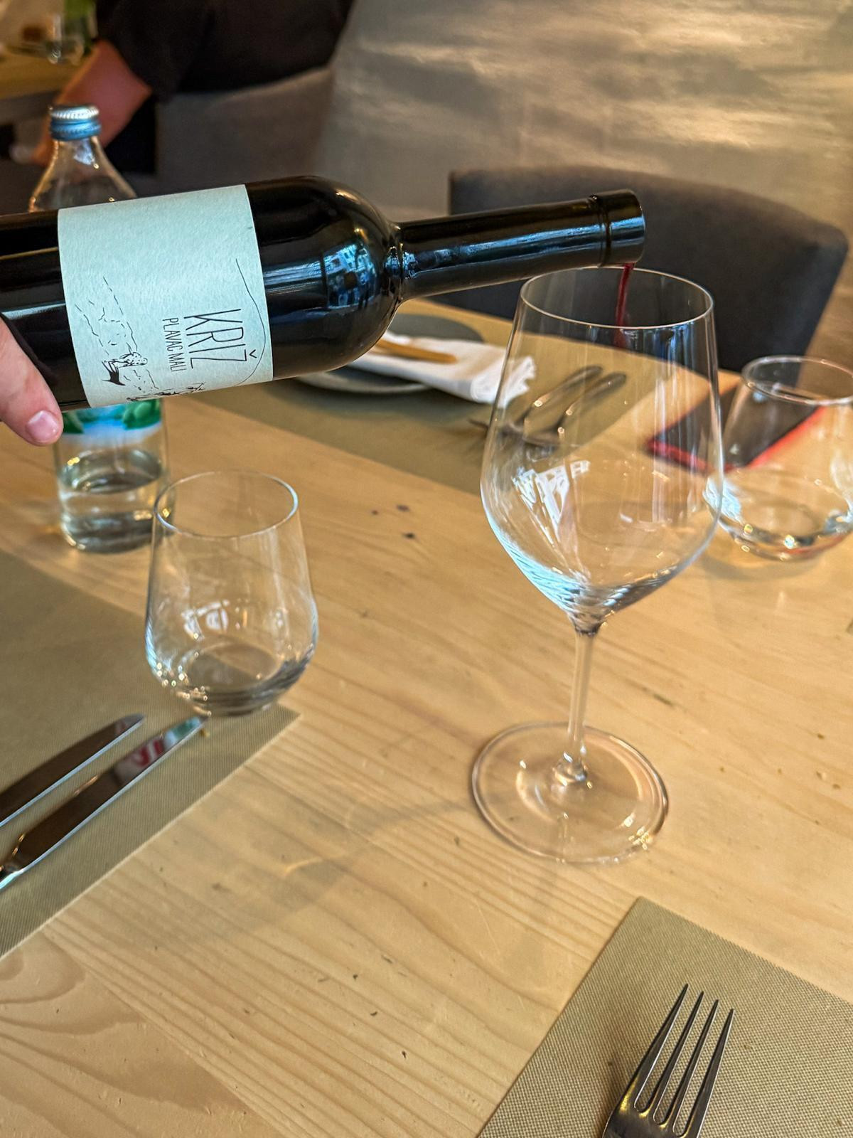 Janjetina i bob (28,80 €) puno nam se više svidjela. Potrbušina janjeta, konfitirana osam sati, od mekoće se raspadala. Gusti, reducirani sok janjetine i pire od mrkve bili su gotovo besprijekorni. No, prezentacija je imala jednu simpatičnu, ali upitnu ideju. Preko tanjura se pružao most – ne onaj od sna, već od boba i listova kelja – koji je služio kao barijera između mesa i pirea. Iako je namjera jasna, izvedba je djelovala pomalo nezgrapno i bila jedina slaba točka inače vrlo solidnog jela. Ono što nije bila slaba točla, nego se kako spada snašlo uz janjetinu, bila je čaša Plavca Malog vinarije Križ (9,60 €), iznimne pitkosti i mekoće.