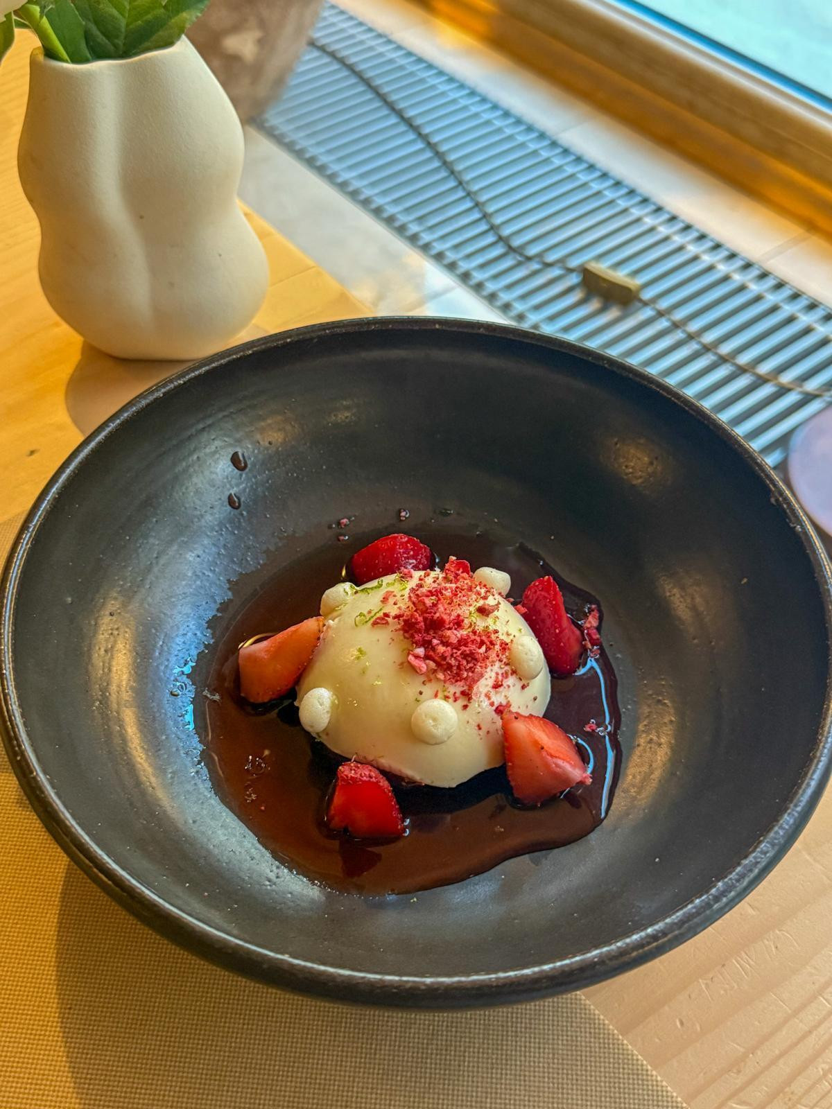 Posljednje predjelo, Brancin i jagoda (20,80 €) iz sezonske ponude, odvažan je spoj koji se pokazao punim pogotkom. Marinirani brancin bio je sočan, umak od celera i jagoda nježan, ali postojan, a tanko nasjeckane, gotovo hrskave, stabljike celera i svježih jagoda vrlo su se promišljeno igrale s okusom ribe. Daleko najbolje jelo koje smo jeli te večeri.