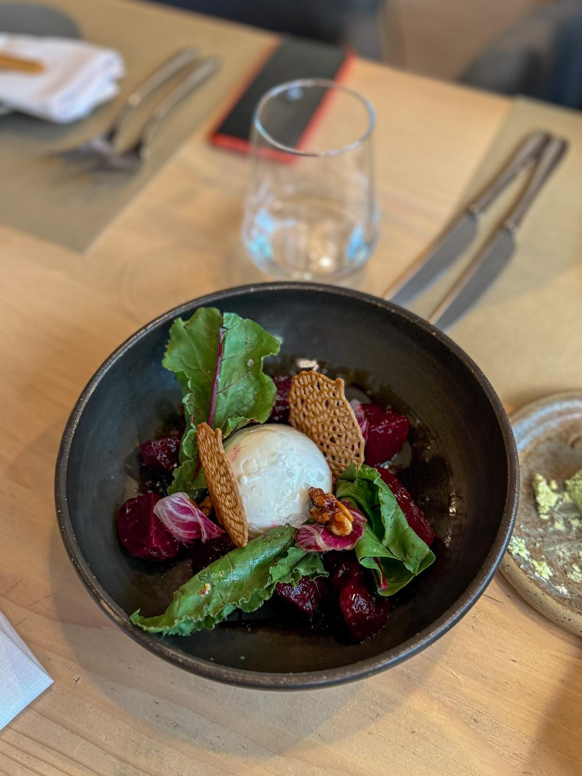 Ubrzo je stiglo naše prvo predjelo, Burrata (19,20 €). Ovo predjelo dolazi u velikoj zdjeli u kojoj se nalazi velika burrata poslužena na kremi od cikle, s velikim komadima cikle, radičem, orasima i reduciranim moštom. Naizgled jednostavno (i skupo) predjelo pokazalo se izvrsnim; cikla je bila spremljena al dente, burrata kremasta te je cijelo jelo stvaralo kohezivnu cjelinu. Iako, zaista, 19,20 eura za ovo predjelo ipak je previše.