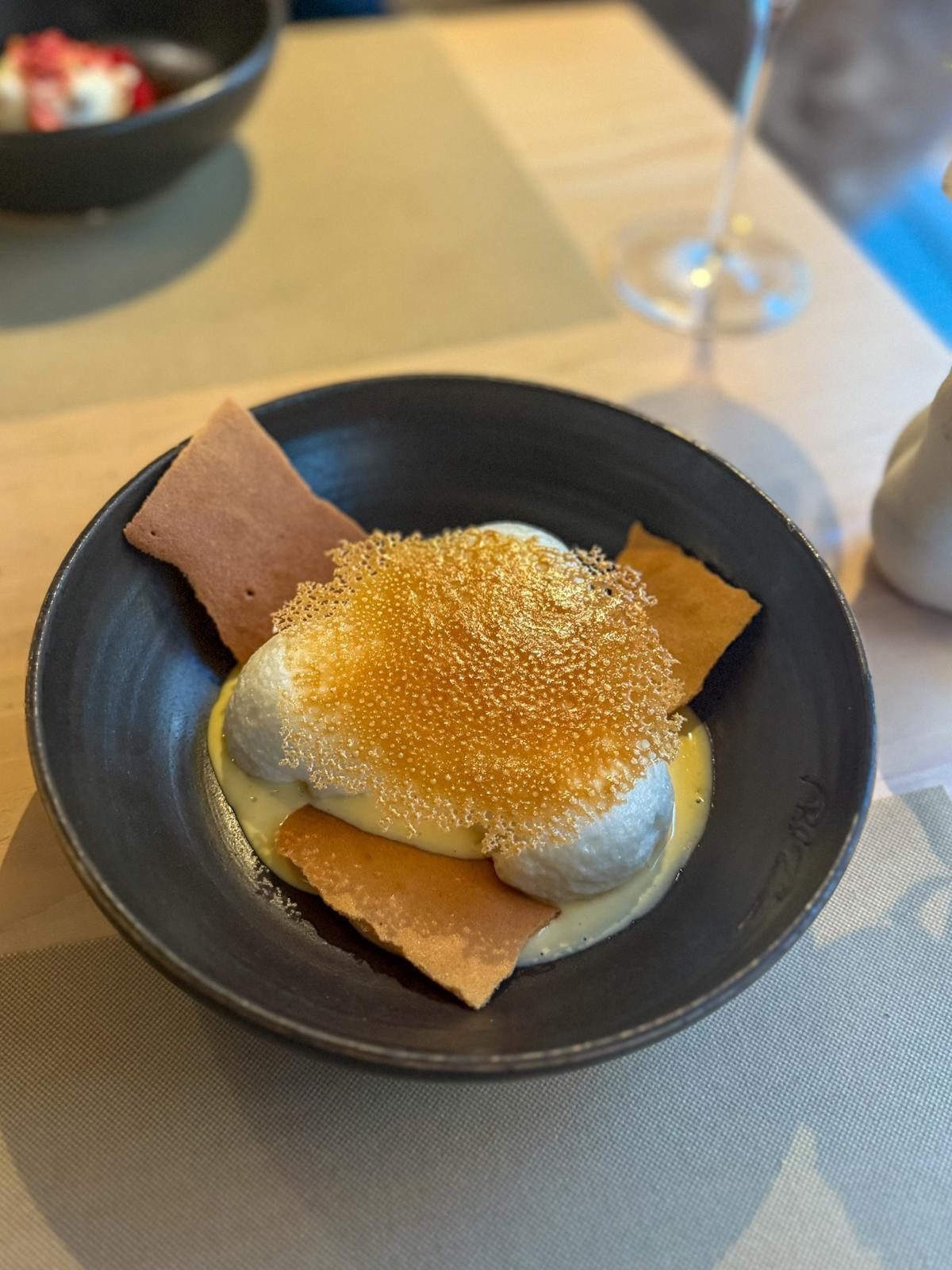 Večeru smo završili s dva deserta. Jagoda i bazga (8,40 €), odnosno panna cotta od bazge na biskvitu s consomméom od jagoda bio je solidan, no nedostajalo mu je karaktera i kreativnog potpisa koji bi ga izdvojio od sličnih deserata. Šnenokle (8,20 €) su bile puno bolji desert – zabavna interpretacija s hrskavim keksima, nježnom kremom od vanilije i još hrskavijim tuileom od bijele čokolade.