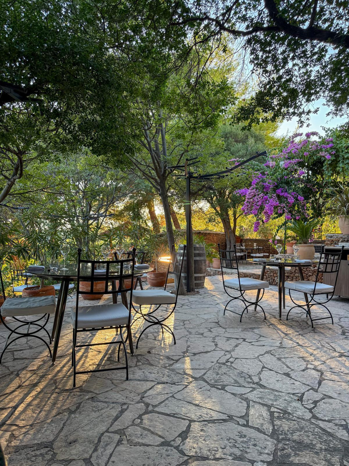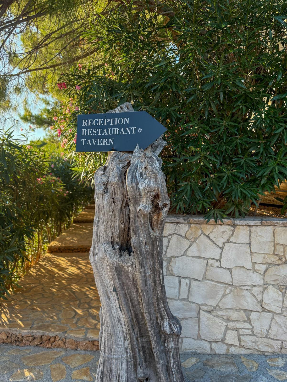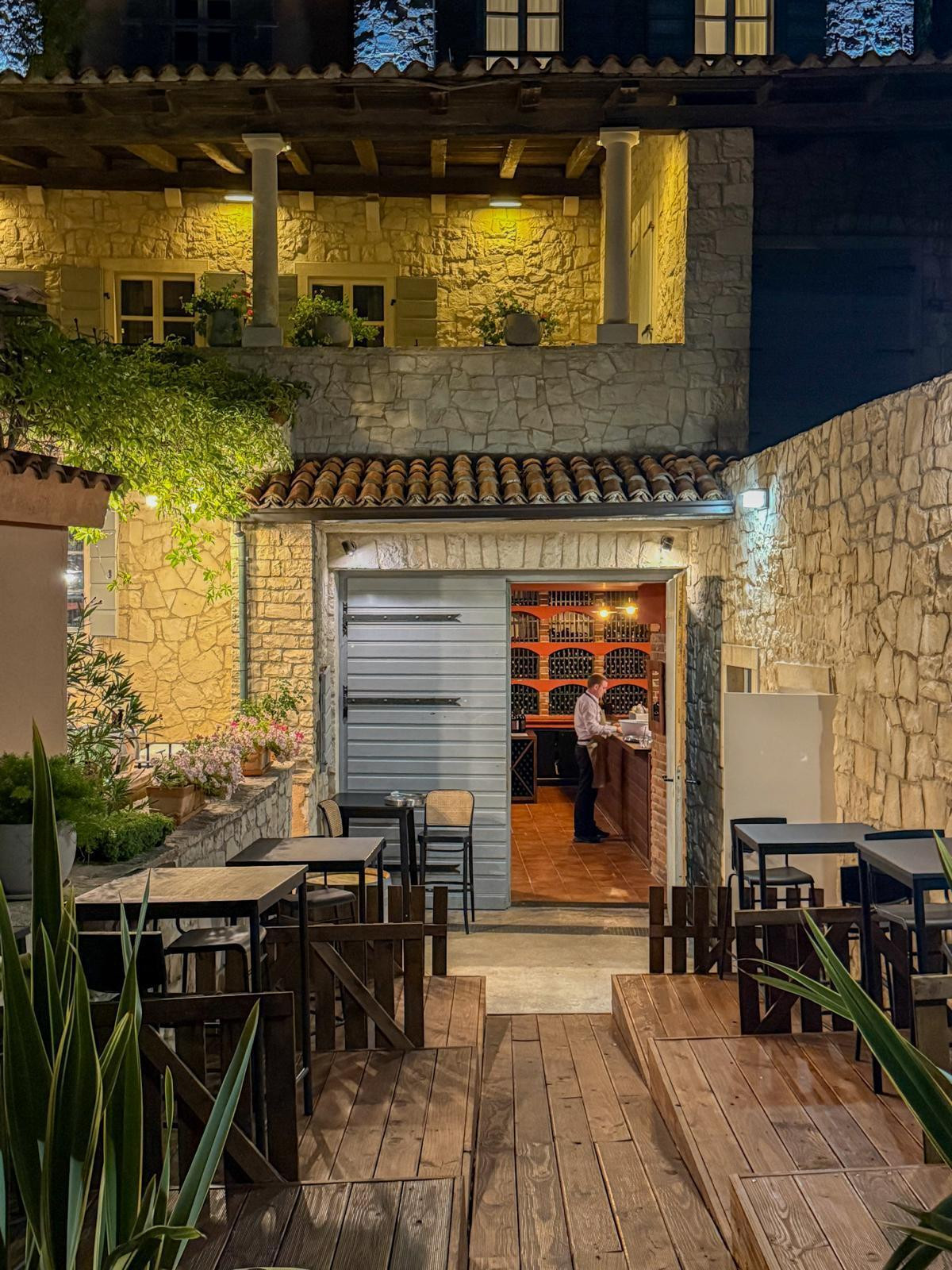 Vozeći se do restorana, penjući se uz gustu borovu šumu, vinograd i stabla maslina, jasno je da dolazite na posebno mjesto. Sam ulaz u restoran prilično je slikovit. Velike kamene stepenice vode do terase restorana, koja se nalazi iznad istoimene konobe gdje se spremaju autohtona jela. Budući da smo te večeri stigli prvi, dobili smo i najbolji stol terase. Dočekala nas je glavna konobarica restorana, koja nadgleda cijelu terasu, i odvela do stola. Blago uzdignut, intiman stol u kutku terase, kamenom uokvirene i obgrljene zelenilom. Iako glazba potiho svira, najglasnije pjevaju cvrčci, prirodni orkestar koji smiruje puls večeri i vrlo dobro odgovara ambijentu.