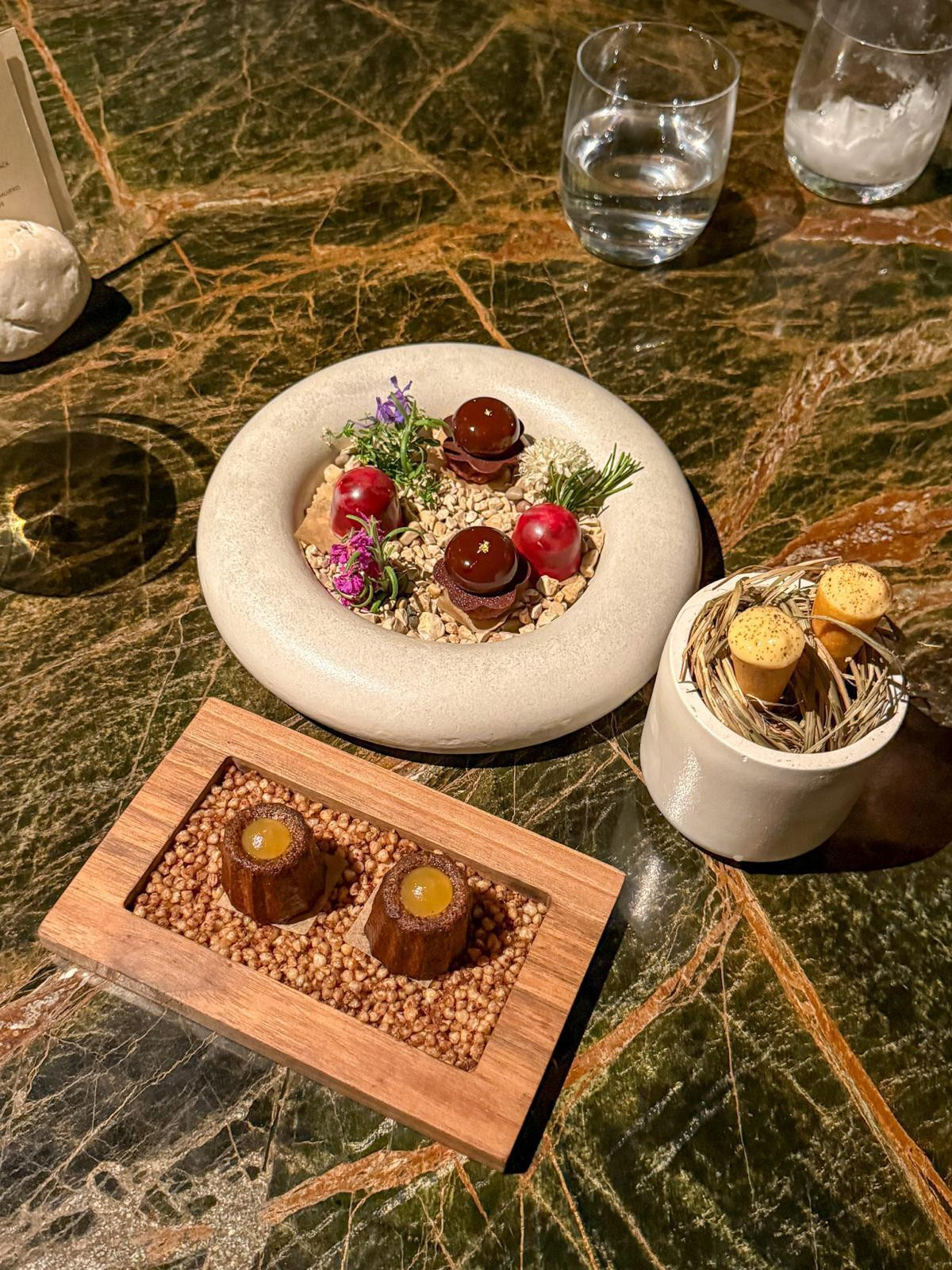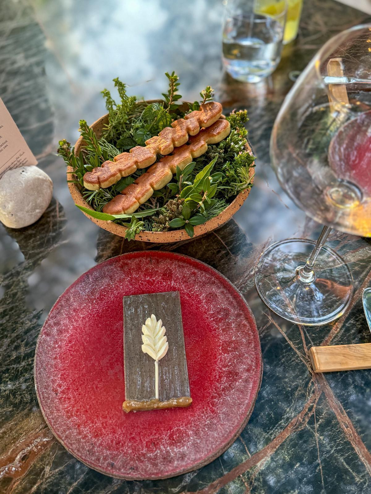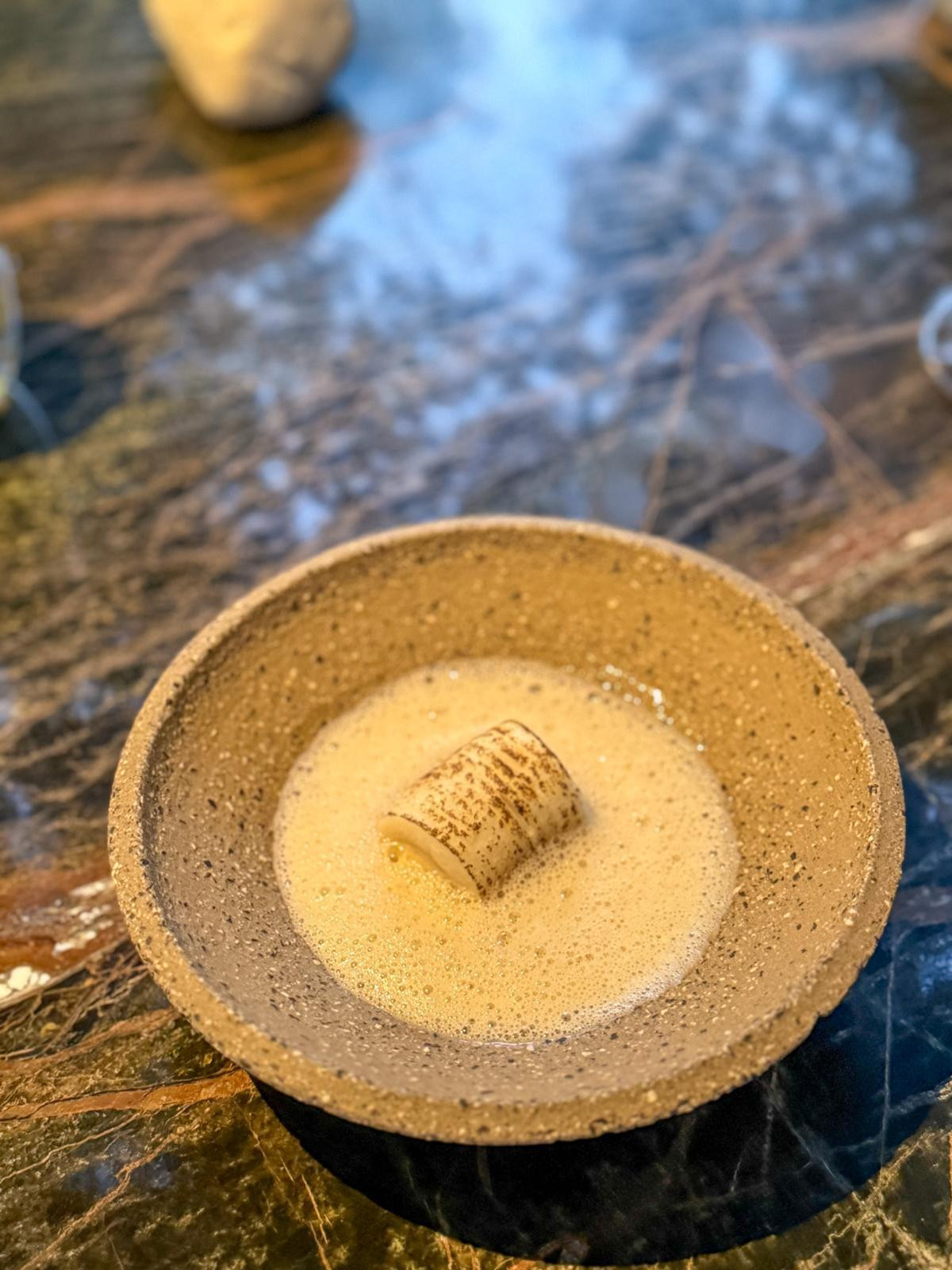 Nakon kratkog predaha nastavlja se igra. Kruh i maslac, ne bilo kakav. Tri maslaca. S janjećom masti, od paljenih borovih iglica i paljeni s cvijetom soli. Sam prikaz maslaca bio bi dovoljan, ali tu je i kruh od komorača pečen na tabli. Igra tekstura je sjajna. Svaki maslac nosi svoj potpis, a kruh je nevjerojatno mekan i aromatičan, toplog i dugog finiša.