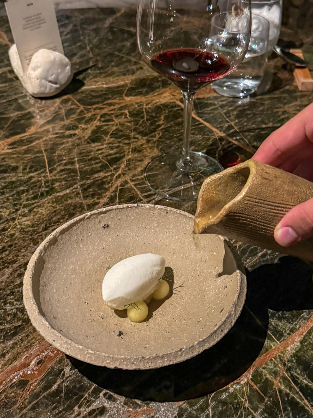 Slani dio je gotov, ali naše uzbuđenje ne pada. Preddesert, sladoled od kefira ovčjeg mlijeka i poširanih jabuka, s chutneyjem od komorača, preliven je consomméom od ružmarina i uljem mente. Prozračno, lagano i osvježavajuće, kao da kroz tanjur propuše kratki udar paške bure. Savršena priprema za glavni desert.