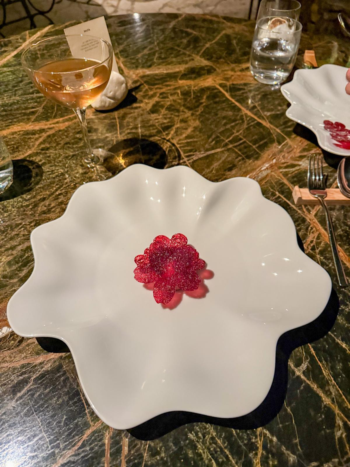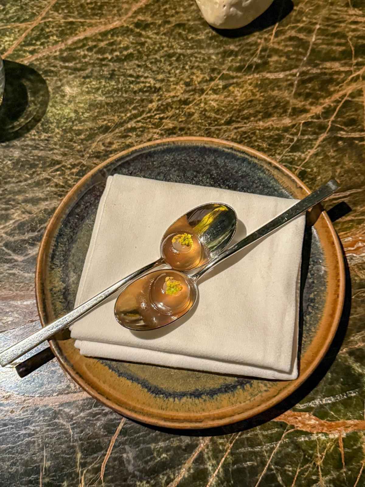 Slijedi čistač okusa, priprema za glavno jelo. Sfere punjene čajem od kadulje, gel od limuna i cvjetna pelud. Kratka i snažna eksplozija koja resetira nepce i otvara prostor za finale.