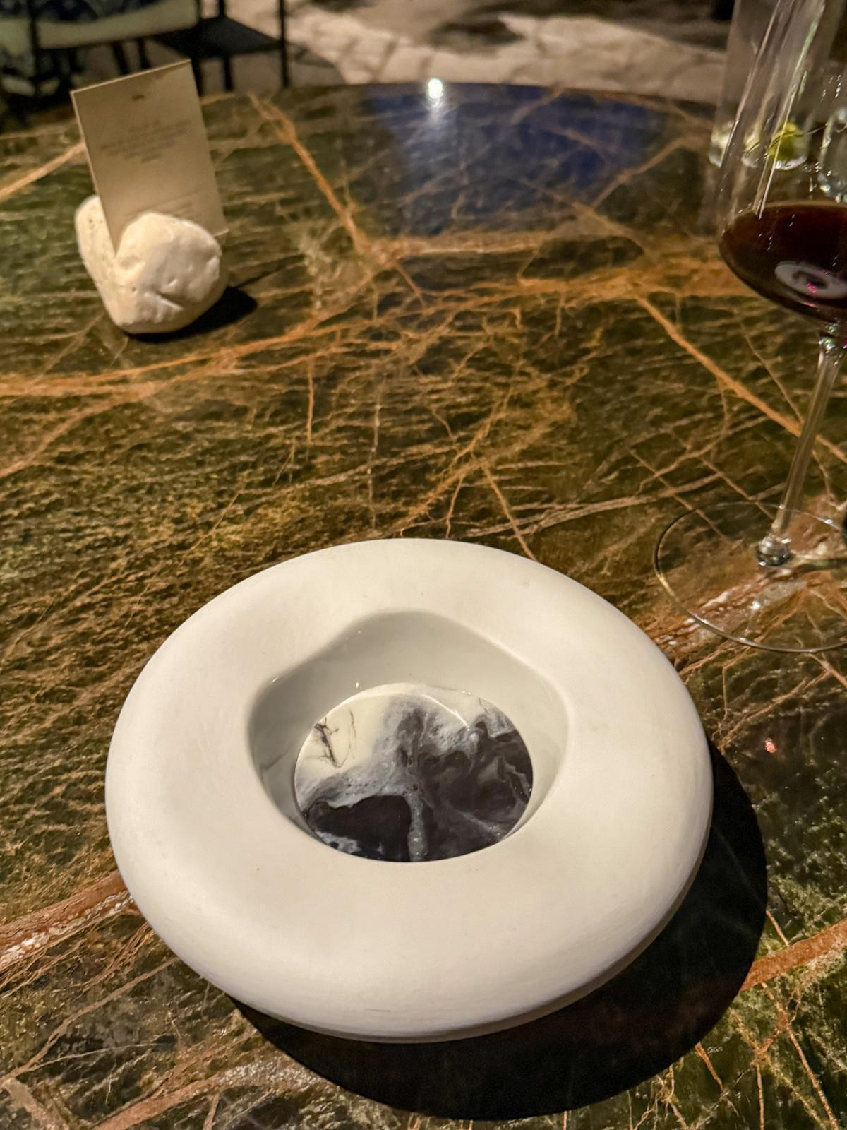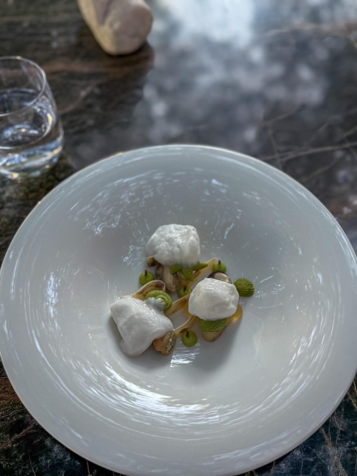 Nakon kraćeg predaha stiže prvi slijed večeri. Reinterpretacija buzare, jelo puno komponenti i tekstura, igra mora, valova i školjki. Otvorene dagnje na pari punjene su tartarom od kratko poširanih jadranskih kamenica, uz gel od jabuke i vina, emulziju od bosiljka i mousse od zelenih maslina i vermoutha koji izgledaju poput ljuski školjaka, a sve je prekriveno slanom, maslenom pjenom od bijele buzare. Teško je to prevesti u riječi. Mnogoslojno, a skladno, kao snimka uzburkanog dana na pučini. Uz buzaru smo pili vrlo lepršavo, ljetno vino Calma 2022.