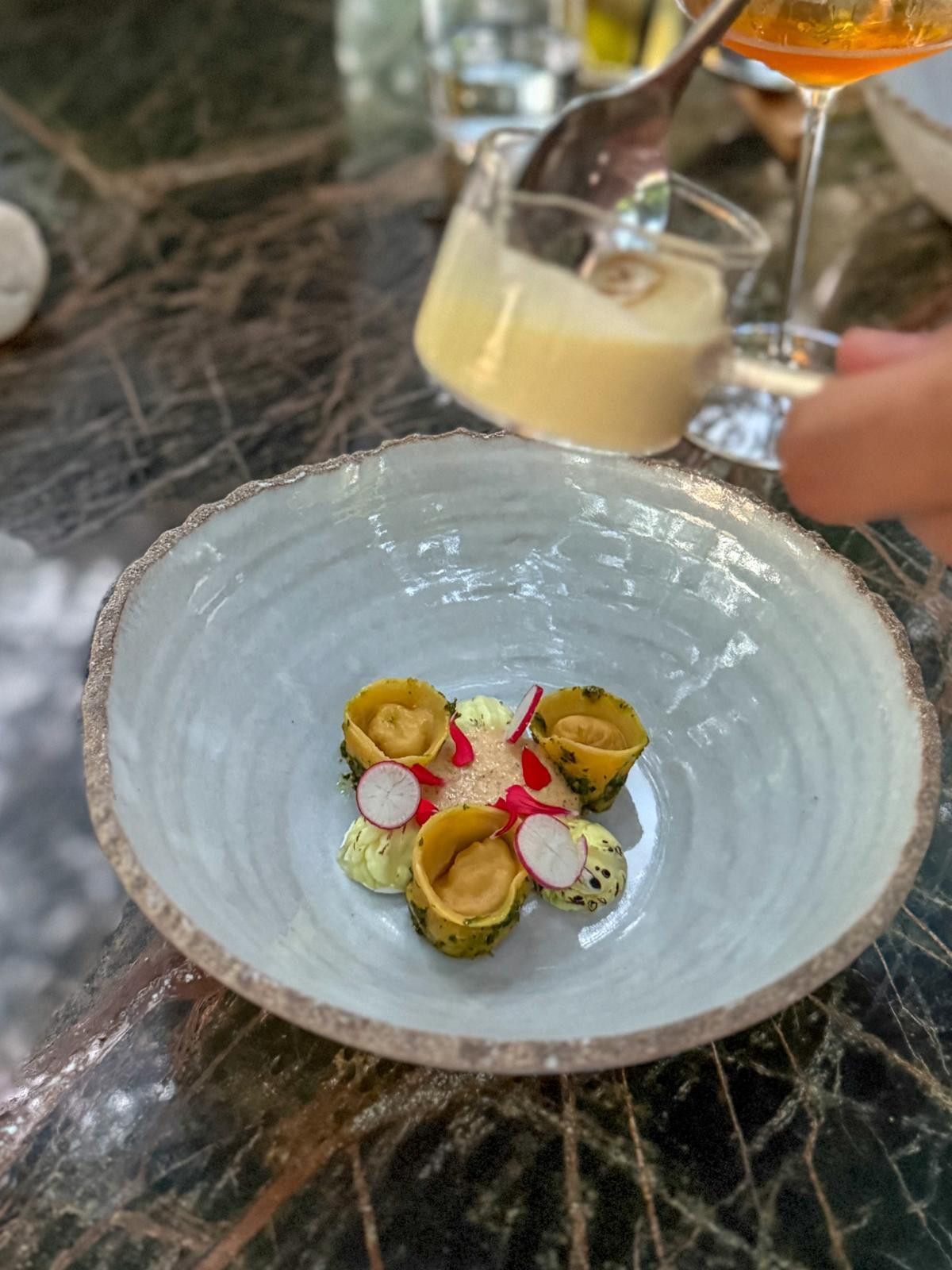 Nastavljamo s pivcem. Cappelletti punjeni pijetlovim mesom i pestom od medvjeđeg luka, uz paljeni kelj s fermentiranom skutom, rotkvicu i umak od hrena. Cappelletti su sasvim dobri, no skuta, kao zasebni segment, briljira i osvaja teksturom. Jelo dodatno uzdiže čaša ponovljenog gegića Ocu, u lijepom paru s hrenom.