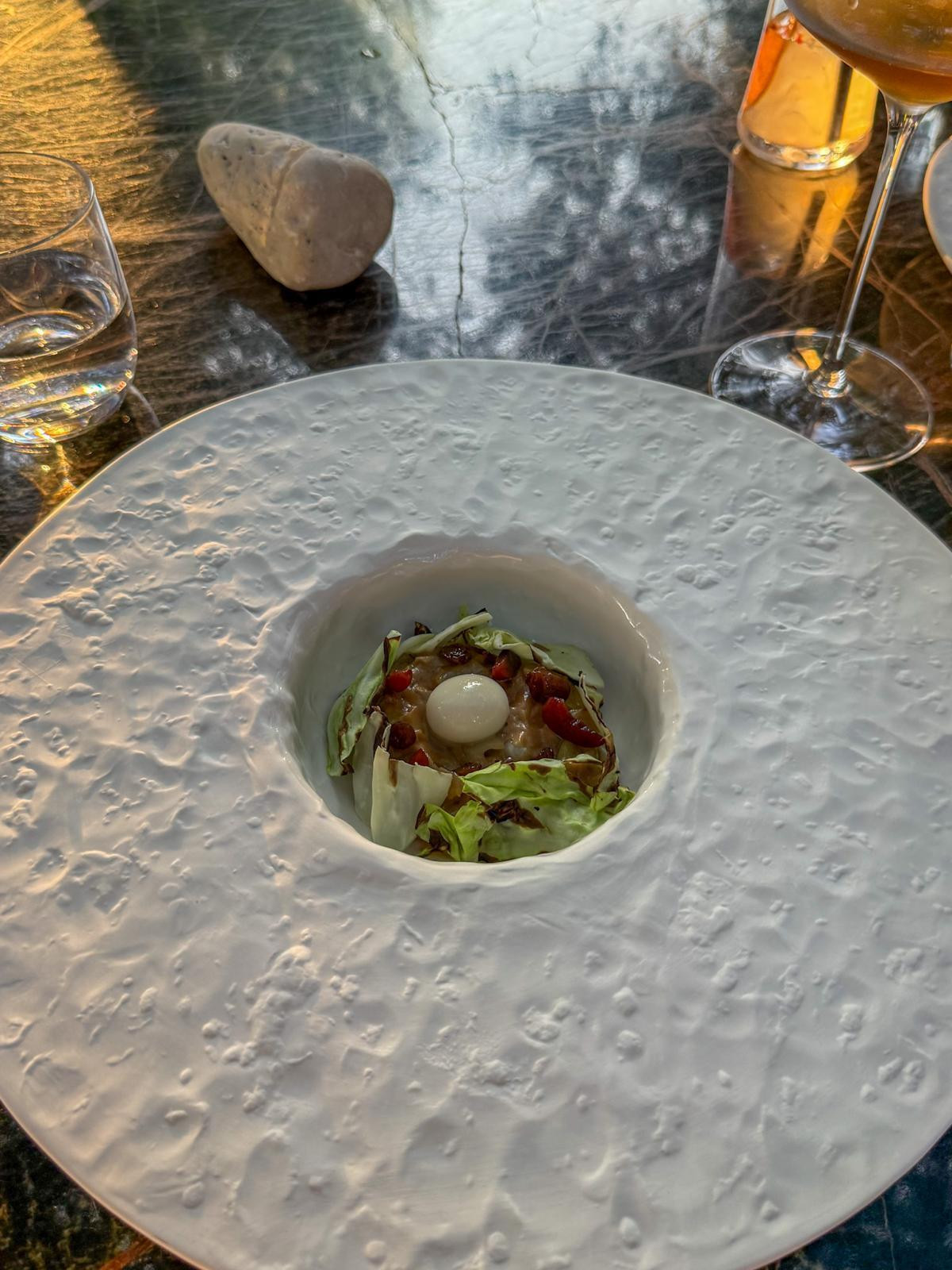 Kako popratiti tako bogat drugi slijed? Još snažnijim, mesnatijim, posve genijalnim zeljem. Koliko smo načuli, ključnu ulogu odigrao je vrhunski sous chef Dominik Mrkonjić, i zaslužuje pljesak. Tri lica zelja. Salata od mariniranog zelja, ragu od zelja i paškog sira i pečeno zelje, podignuto ukiseljenim grožđicama i fermentiranim trešnjama. To je onaj Ratatouille trenutak kada pred vas dolazi naizgled jednostavno jelo, duboko ukorijenjeno u tradiciju, a dotjerano do točke da zamolite konobara za reprizu, te vam pero ispadne iz ruke. Uz genijalno zelje pili smo jednako posebno jantarno vino Ocu 2021, stopostotni macerirani gegić koji je nastao kao Šuljićeva posveta svome ocu.