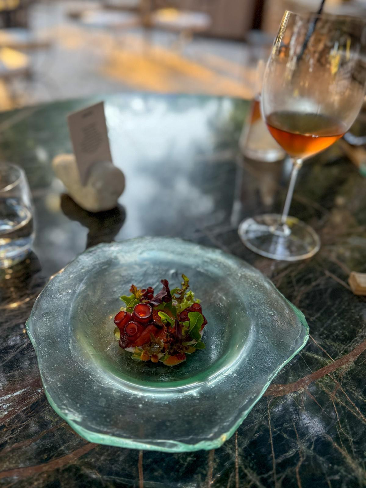 Tempo kuhinje ostaje brz, ali odmjeren. Hobotnica položena na kremama od limuna, koromača i hobotnice, s listićima svježe salate, jagodama i dashi želeom. Pred nama konobar prelijeva pikantan i bogat gazpacho od rajčica koji zaokružuje jelo i daje mu kičmu. Hobotnica je perfektna, mekana i elastična, a najljepše iznenađenje su hrskavi tostirani kapari koji s hobotnicom funkcioniraju odlično. Zasad najambicioznije jelo upareno je s jedinim roséom vinarije, Luzar 2022.