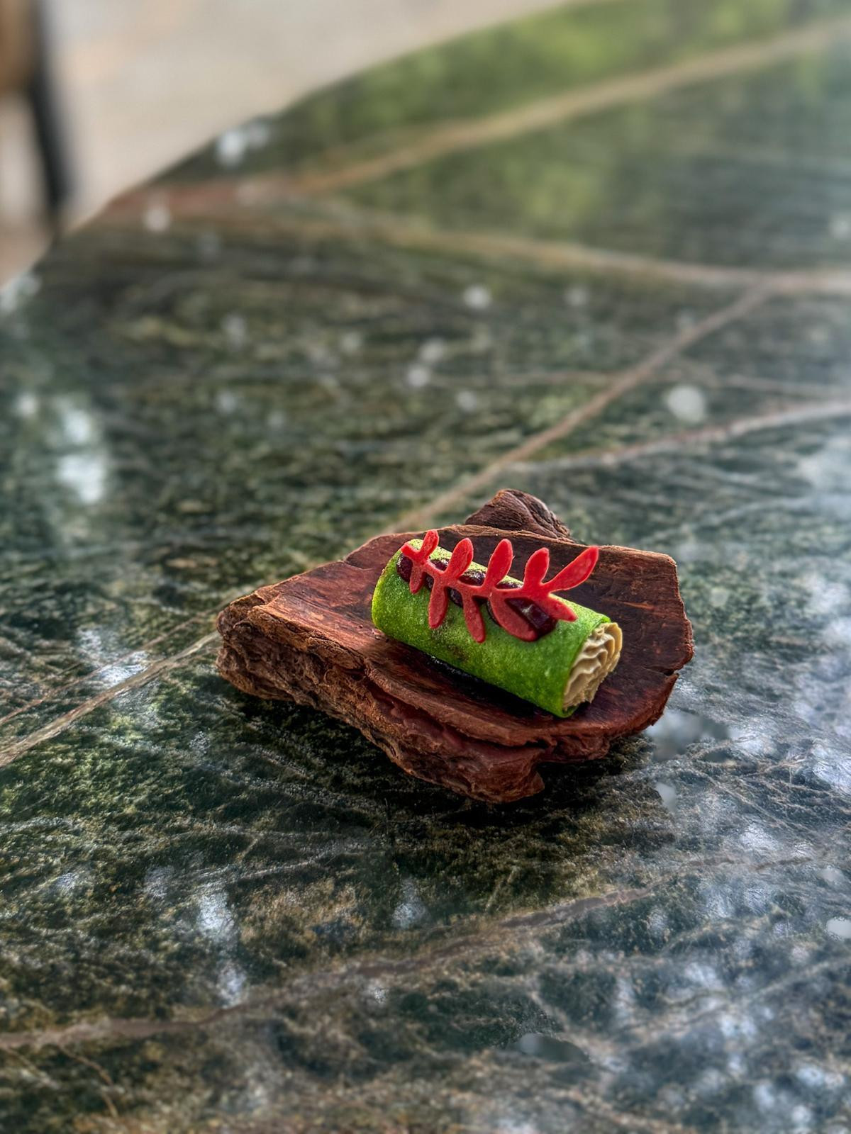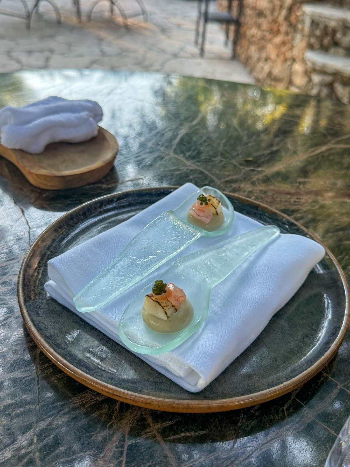 Četvrti pozdrav, koji stiže na komadiću drva, pokazuje povezanost kuhinje s tlom otoka. Hrskavi cannellone punjen paštetom od janjeće jetrice, salatom i gelom od cikle, posut timut paprom, donosi slatkastu, džemastu dimenziju koja pršti slanom zemljanošću. Uz pozdrave smo pili svjež pjenušac Viaz Brut, napravljen tradicionalnom metodom.