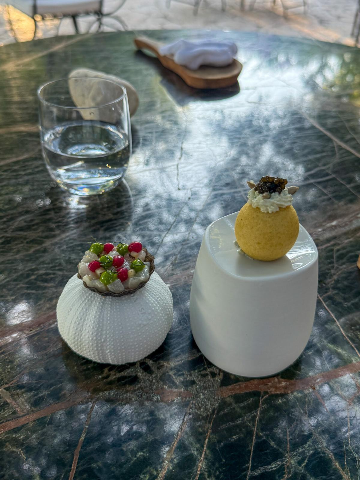 Ubrzo kreće predstava. No prije nje na stol stižu mali, topli ručnici s aromom lavande, kako bismo osvježili ruke. Pozdravi iz kuhinje, četiri zalogaja, vizualno atraktivna. Redom, krema od gregade, marinirani škamp, bijela riba iz ulova te emulzija od škampa i alge stvaraju uzbudljiv, čvrst i kiselkast osjećaj u ustima. Stiže i fritula od bakalara, crème fraîche s algama i kavijarom, vrlo slastan zalogaj. Najuzbudljiviji pozdrav chefa bio je saur (savur), odnosno tartalet punjen brancinom s emulzijom od peršina i gelom od saura. Briljantno i vizualno i okusom.