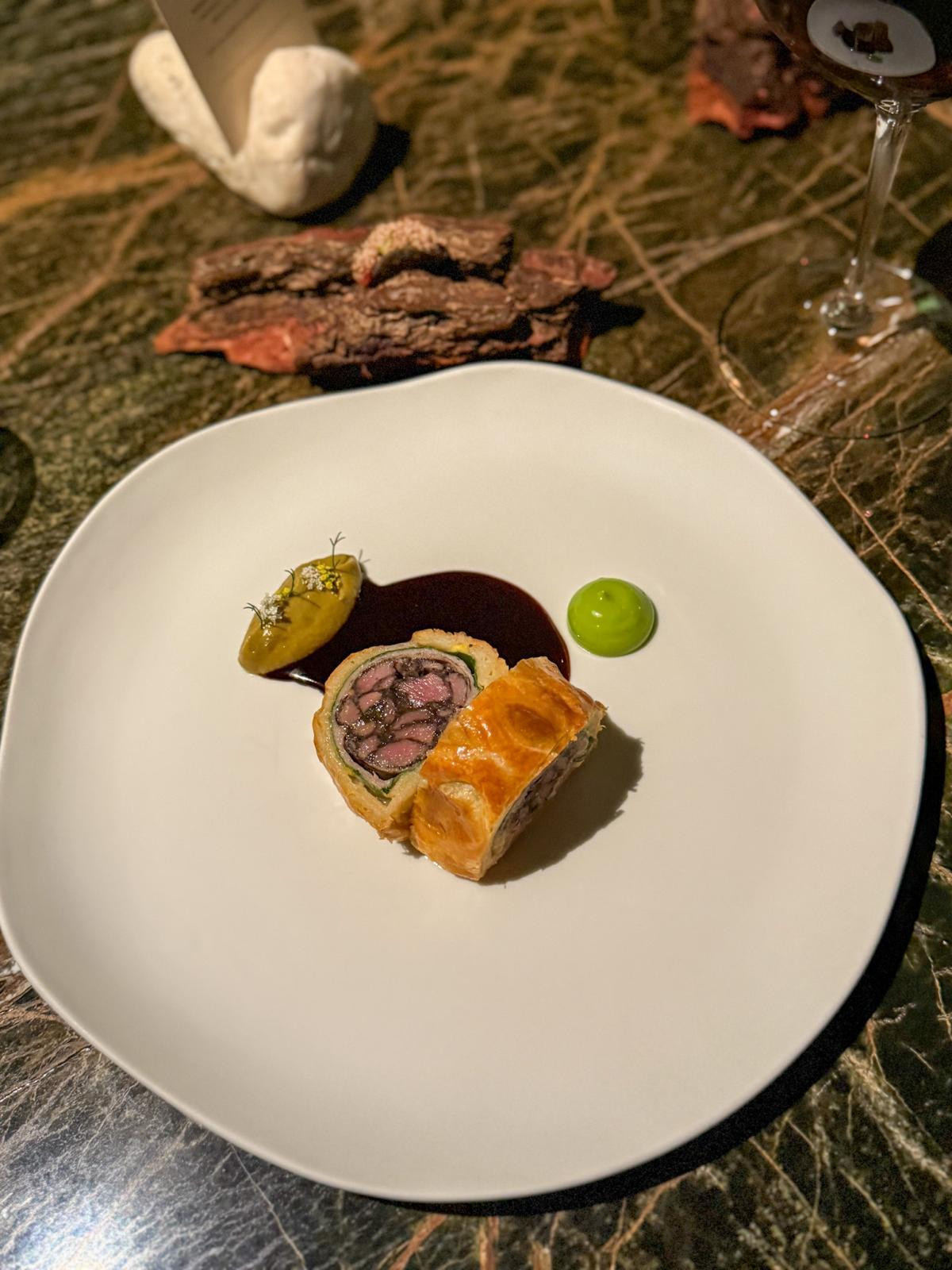 Stiže zvijezda večeri, a uz stol dolazi i sam Bregeš. Janjeći Wellington reže se pred nama. Paški janjeći file, umak od ovčje sirutke, prah od poriluka i slanih inćuna, krema od paljenog poriluka i inćuna i marmite umak od starog kruha, poriluka i inćuna, uz zelenu emulziju od vlasca. Bregeš ga sprema sve sigurnije i ostavlja dojam vrhunca forme ovog jela dosad. Prelijeva ga slastan i bogat demi glace. Uz to stiže mali taco s janjećim jezikom i srcem, hrskav, blago gorak i pun umamija, kadar kao iz Babettine gozbe. U čaši je Velika crvena kupaža 2018, gust i raskošan bordoški spoj koji sjajno nosi janjetinu i cijeli slijed.