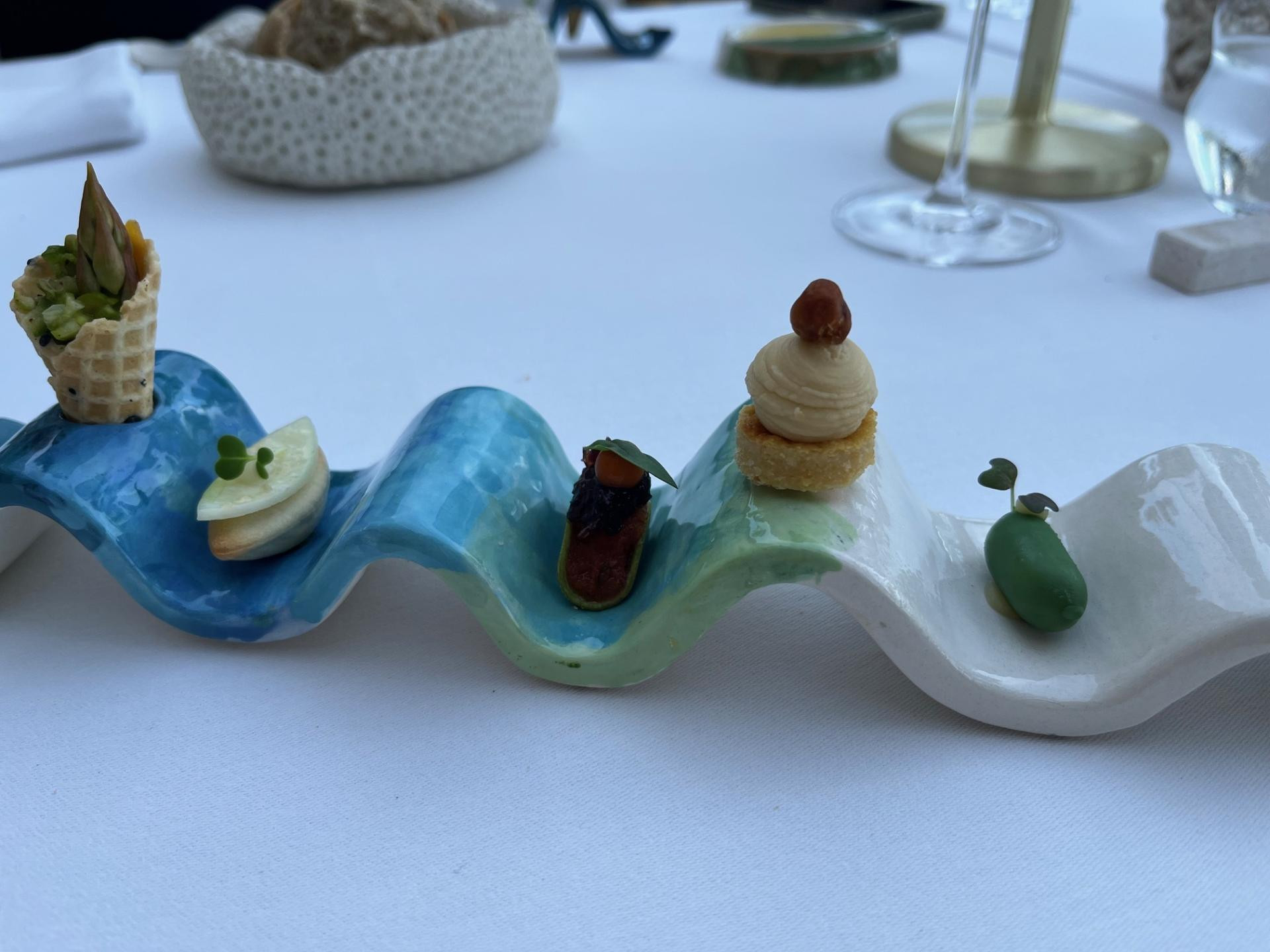 Potom stiže amuse bouche serviran na valovitom tanjuriću sa četiri različita jela od kojih svako priča svoju malu priču. Započinjemo s kornetićem punjenim fritajom od šparoga. Okus je balansiran, ugodno šparogast, slankast, kremast i hrskav. Na drugom valiću se nalazi kroket od krumpira s kremom od blitve s natruhom češnjaka i tikvica, ljetna varijanta starinskih priloga u Dalmaciji – jako fino i ugodno.