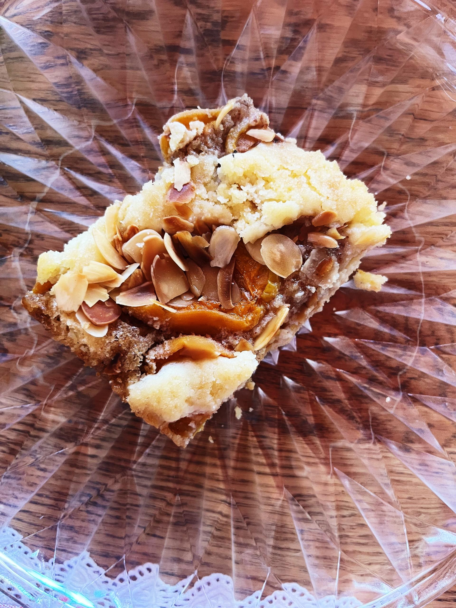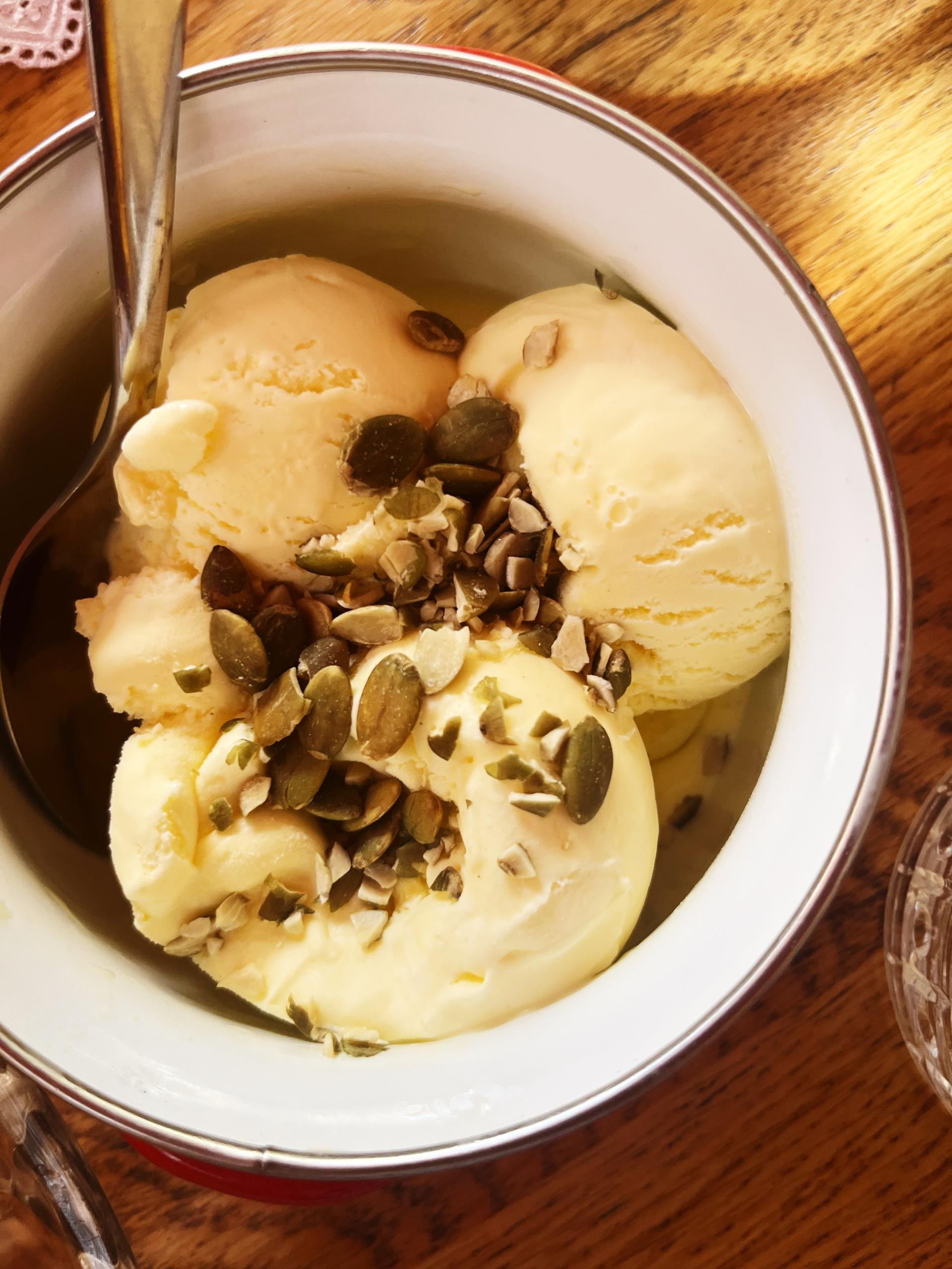Kada smo naručili pitu od marelice, očekivali smo ljepljive, slatko kiselkaste marelice na prhkoj podlozi, a dobili smo kolač s debljim tijestom, frangipaneom od badema i marelicama, koji je bio dobar, ukusan, nije bio suh i zapravo nas je prilično iznenadio. Uz to smo naručili i sladoled s bučinim sjemenkama i uljem, ali smo osoblje zamolili da nam ga ne prelije, već ćemo to učiniti sami. Bili bismo daleko sretniji da u Točkici sladoled rade sami i dodaju mu kakav neočekivan dodatak, ali i ovako, u kombinaciji s pitom, bio je sasvim u redu.