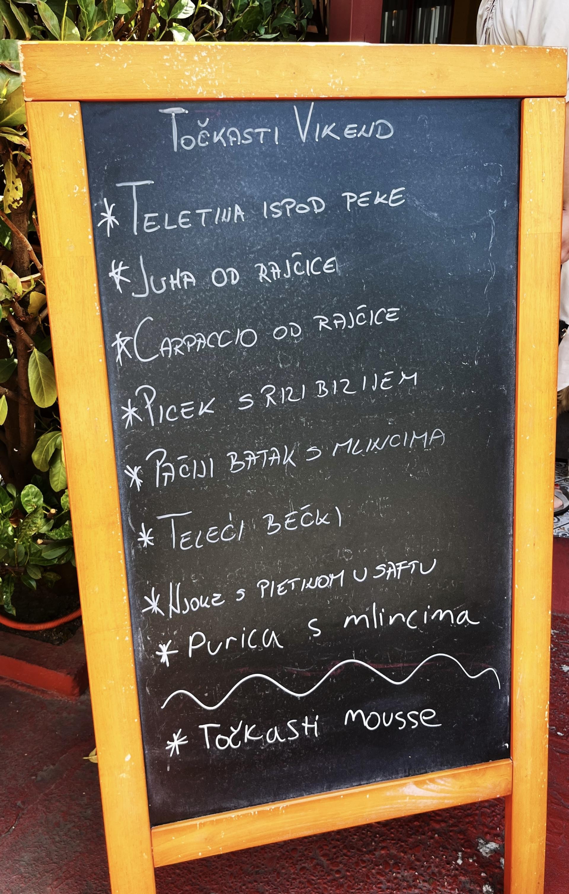 Nakon što smo sjeli za stol i kratko porazgovarali s osobljem, uručili su nam meni i krenuli smo s proučavanjem. Za predjelo smo odabrali carpaccio od volovskog srca (7 €) i zapečene štrukle (7 €), za glavno jelo bečki odrezak od mliječne teletine s krumpir salatom (19 €) i puricu s mlincima (17 €). Uz to, naručili smo i zelje salatu (3,50 €) i porciju kruha (1,80 €), a za desert smo odabrali pitu od marelice (5,50 €) i sladoled s bučinim sjemenkama i uljem (4,50 €).