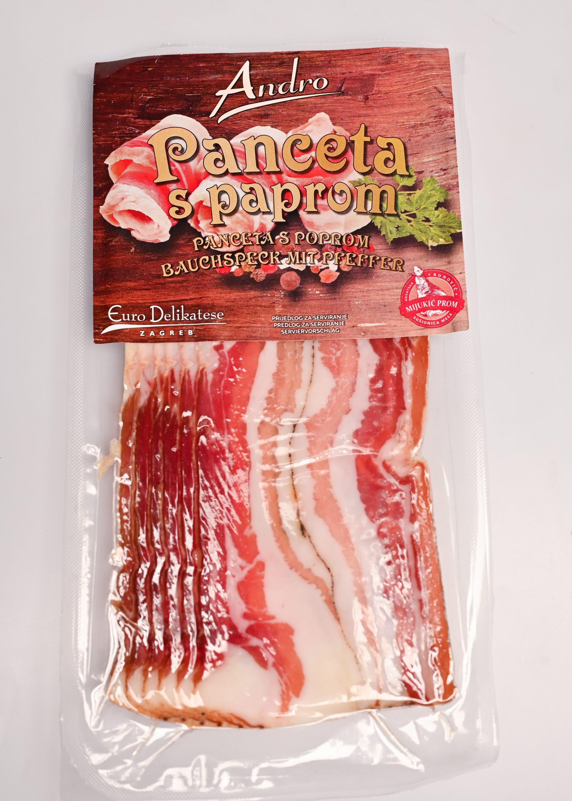 U slučaju da tražite nešto malo drugačije, dobar odabir bit će i Andro panceta s paprom, koju nudi Spar. Mekane šnite. Masni dio i mesni dio su podjednako zastupljeni. Jako dobar miris. Na domaće, kao dim. Lijepa je u ustima, ugodna. Konzistencija joj je ujednačena. Jako je ukusna, taman slana. Ima nešto posebno i papar se lijepo osjeti.