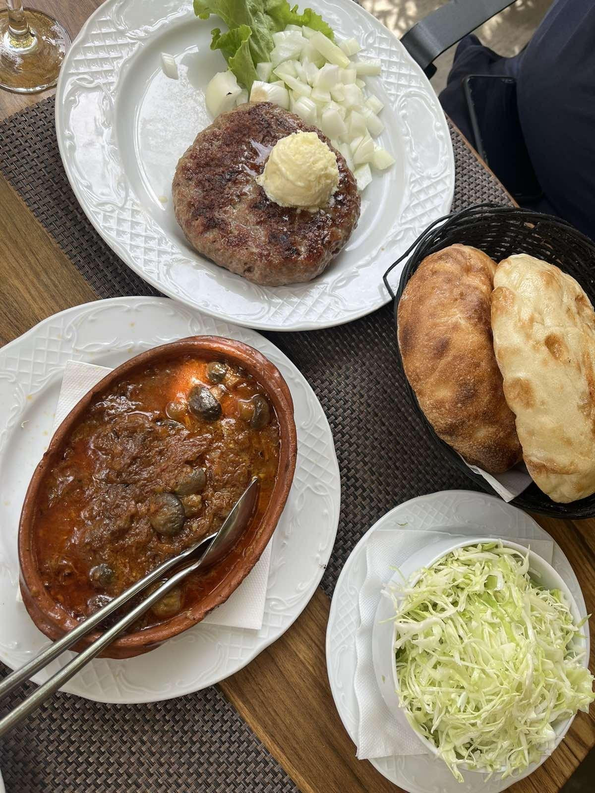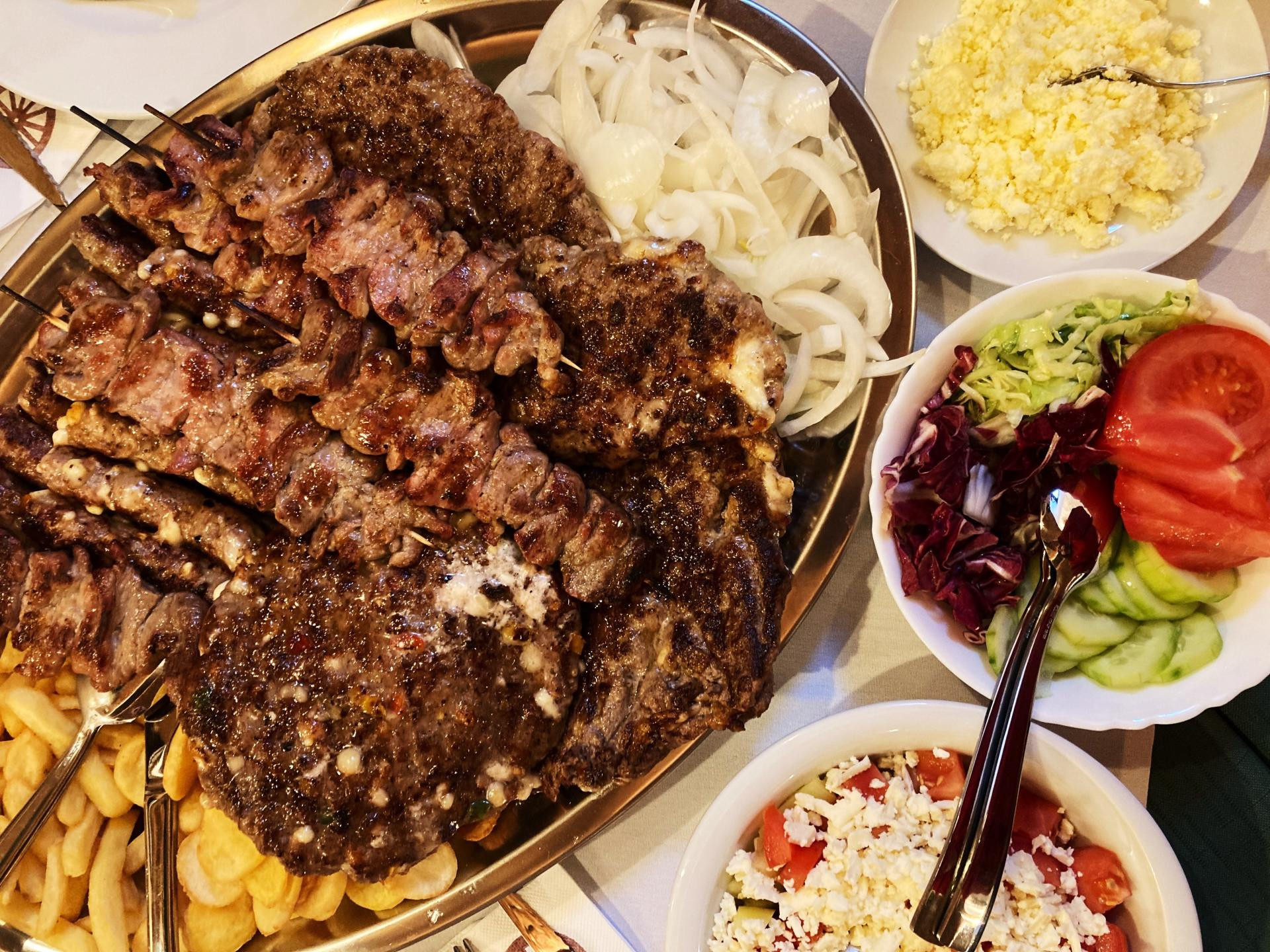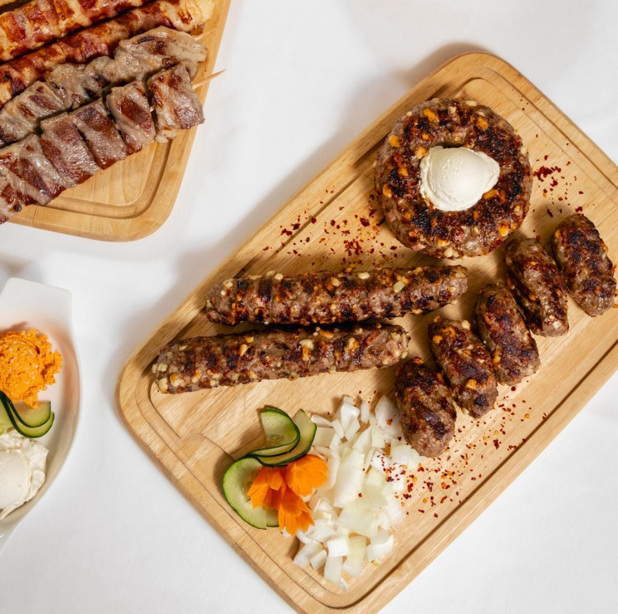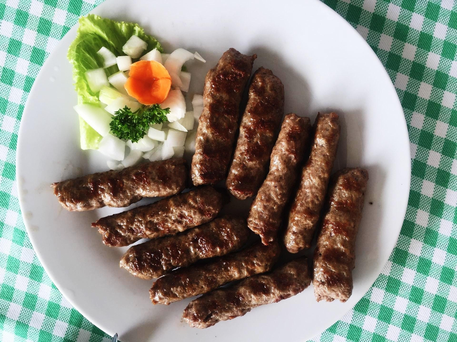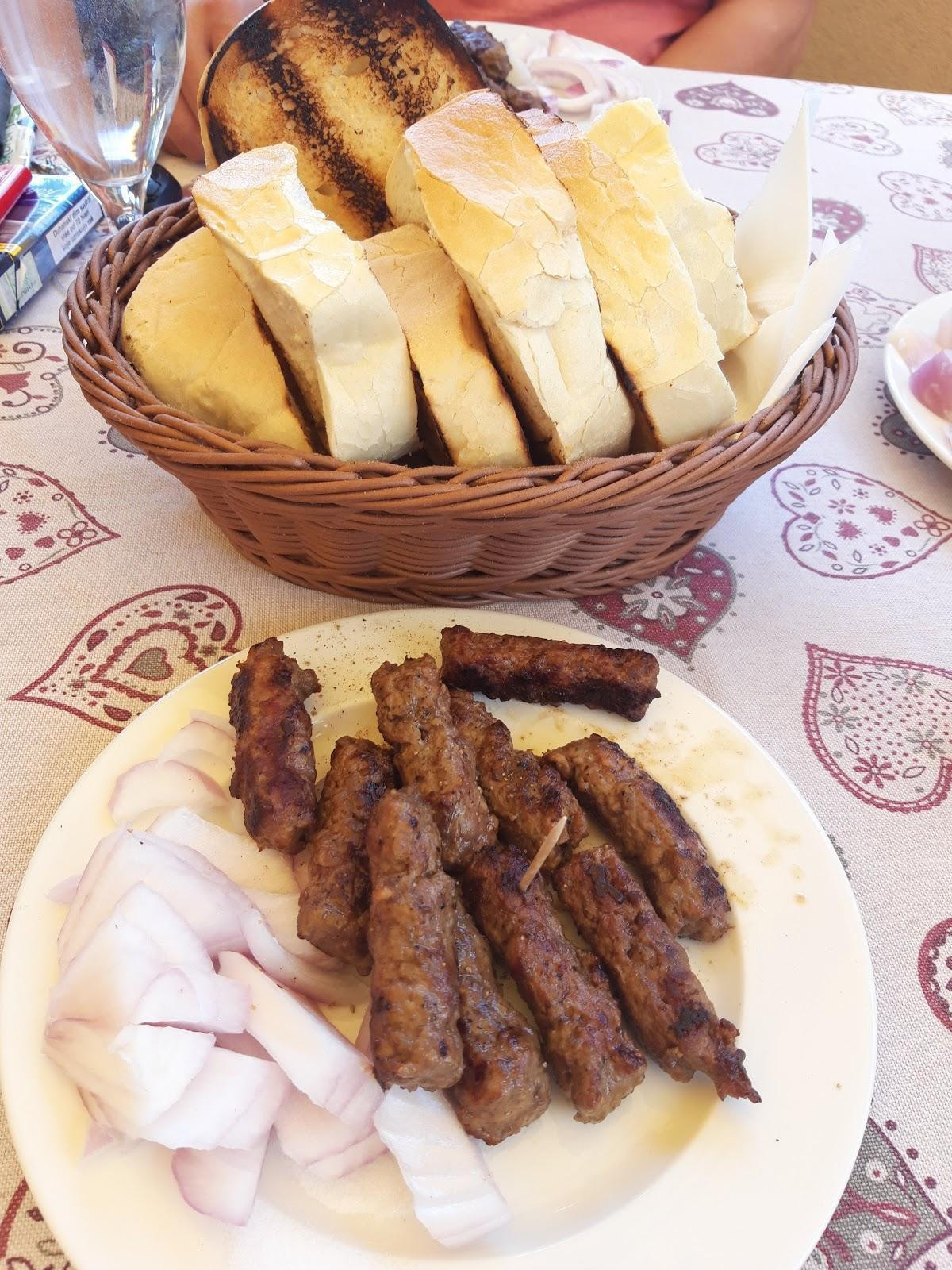 Ponuda je svjesno ograničena - 10 ćevapa ili 3 štapića ražnjića dolaze s ljubičastim lukom, dvije brdašce soli i prepečenim bijelim kruhom (ne lepinja), što zvuči šokantno, ali funkcionira izvrsno. Ćevapi se poslužuju lagano poprskani sitno mljevenim paprom, a meso se peče na drvenom ugljenu što mu daje dubinu okusa kroz Maillardovu reakciju i bogaté dimne arome. Ražnjići su marinirani i meki "poput pamuka", a externa preplanulost doprinosi punoći mirisa.