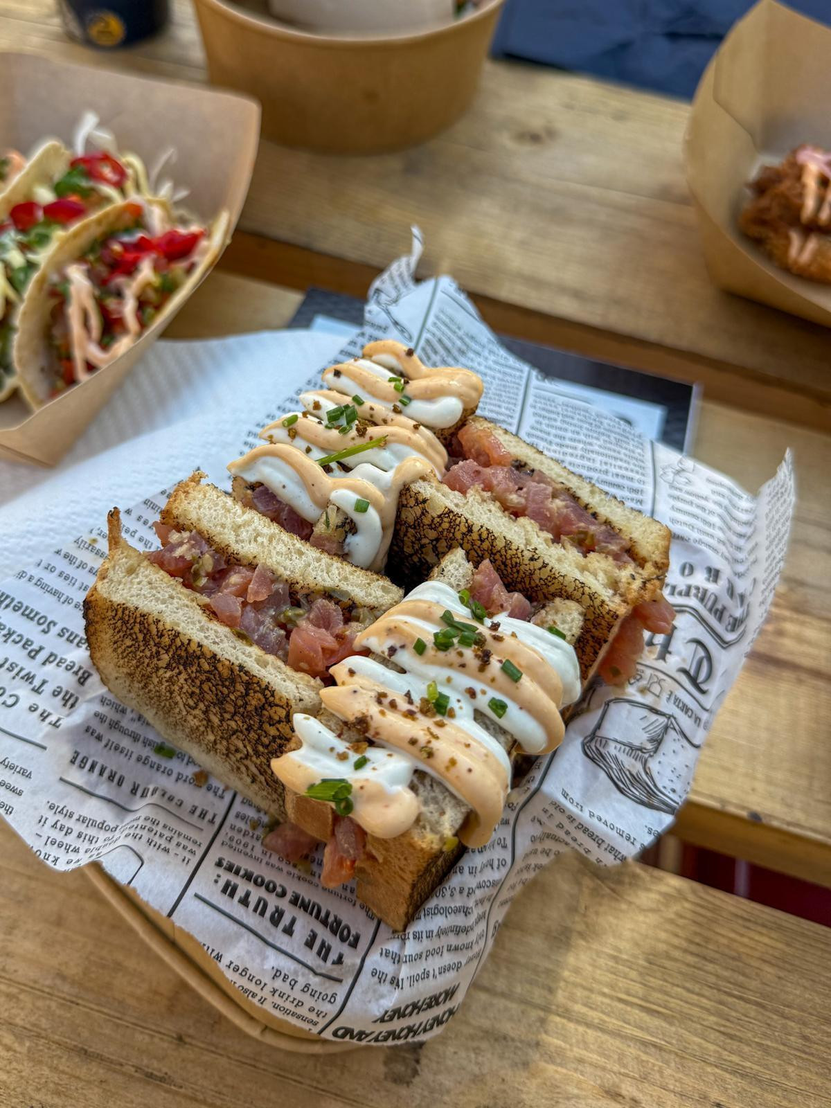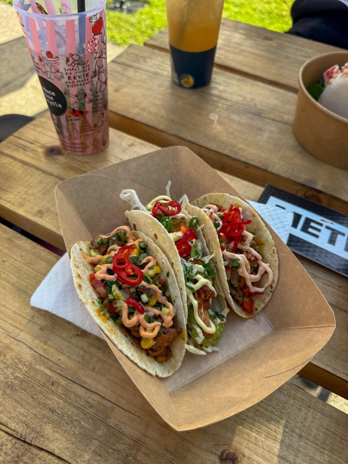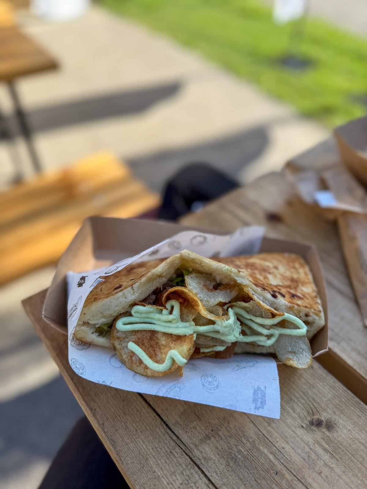 Čim uđete na festival, prvi štand je s tacosima Maria Mihelja. Nude tri varijante: Piletina (10 €), Hrskava kozica (11 €) i Asado rumpsteak (12 €). Zamolili smo od svakog po jedan, jer, da budemo iskreni, nismo htjeli pod suncem pojesti devet takosa, jer u porciji dolaze po tri. Svi su bili vrlo dobri i možda jesu malo nezgodni za jesti - ipak su to tacosi - ali dobro se drže i dolaze u zgodnoj posudici. Najbolji nam je bio s hrskavom paniranom kozicom. Vrlo dobra majoneza, mladi luk i chilli čine odličnu kombinaciju. Sva tri tacosa su blago pikantna, pa ako ne volite ljuto, svakako to recite na kućici.