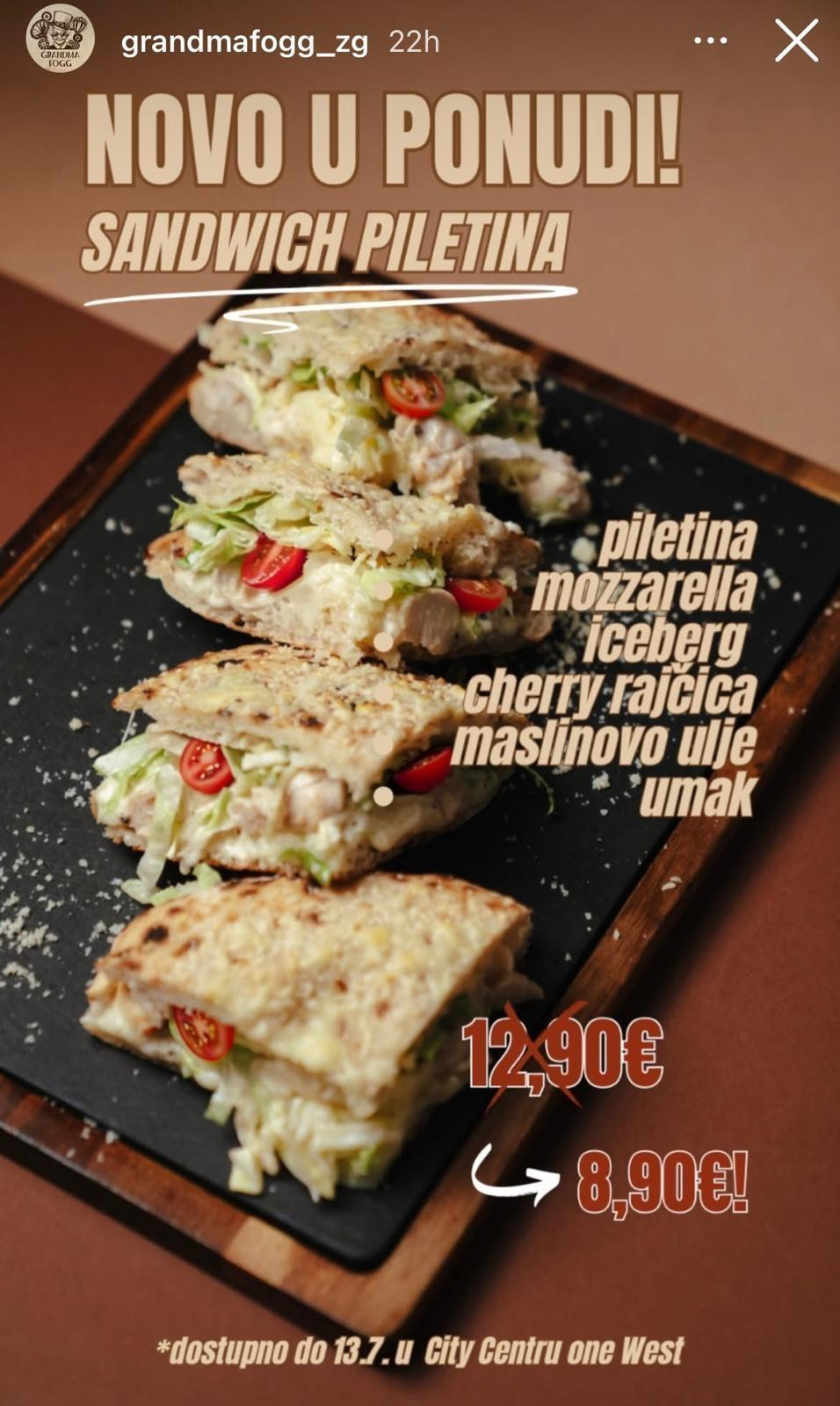 Ovo ljeto na red je došla u pizzeriji Grandma Fogg, sestrinska pizzeriji Mrs. Fogg, u City Center one West, u njihovoj ponudi je od sada osim pizze i ukusan sendvič od piletine koji u sebi nosi prave ljetne okuse poput mozzarelle, iceberg salate, cherry rajčica, maslinovog ulja i sočnog umaka...