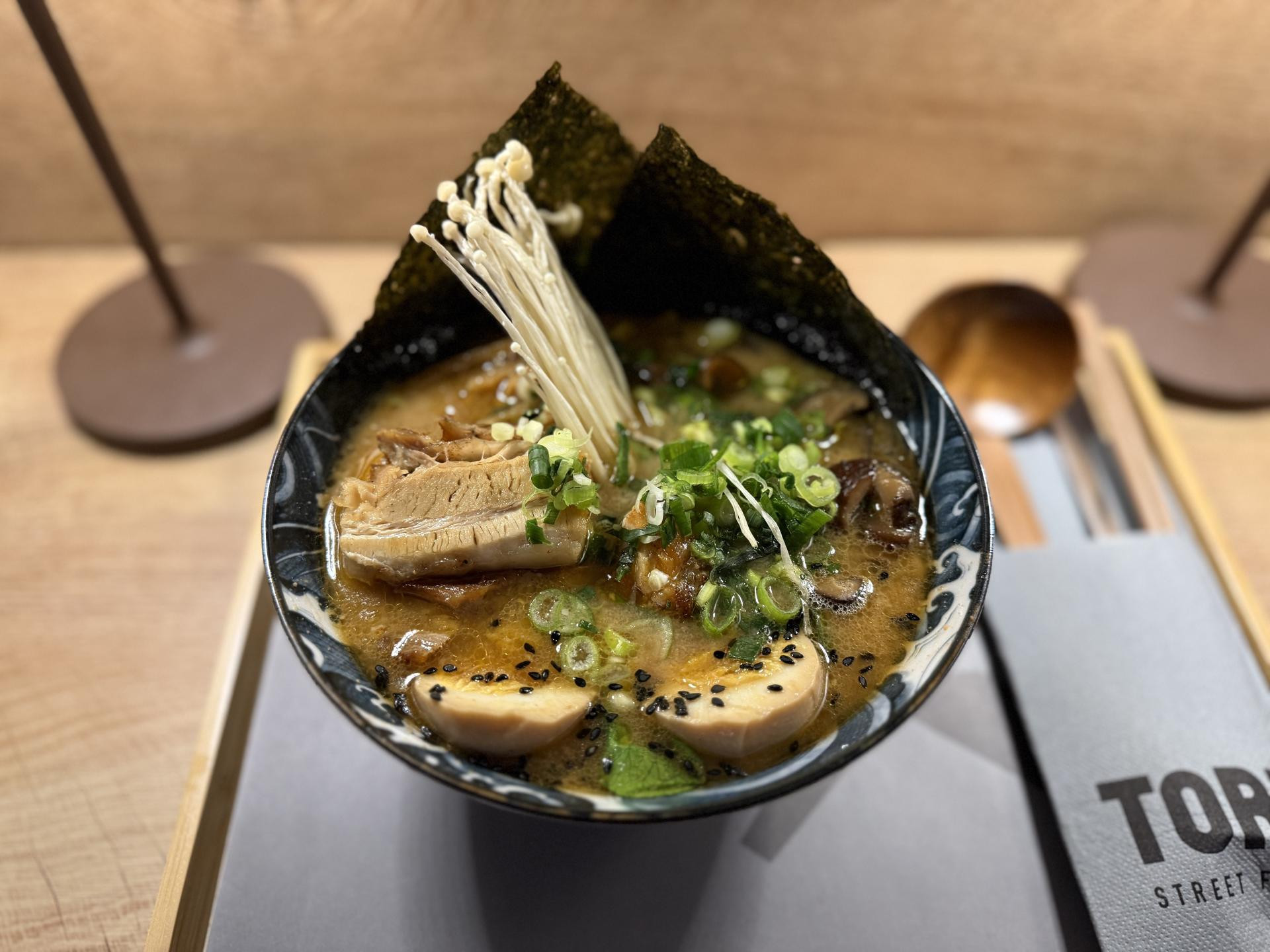 Tantanmen ramen u Toriju nam je baš po volji. Pileći temeljac bogata je okusa, vrlo kremast i duboko aromatičan s blagim prizvukom sezama. Rezanaca je bilo puno, teksturno su bili čvrsti i to nam se posebno svidjelo. Svinjska potrbušina bila je krasno glazirana te se topila u ustima, a marinirano jaje je svojim mekim žumanjkom dodatno pridonijelo kremoznosti ramena. Shiitake, enoki gljive i hrskavi marinirani bambus super su se uklopili u juhu, a hrskavi pak choi odlično je surađivao s ostalim sastojcima. Tantanmen u Toriju, posut mladim lukom i sezamovim sjemenkama, pokazao nam se izvrsnom opcijom.