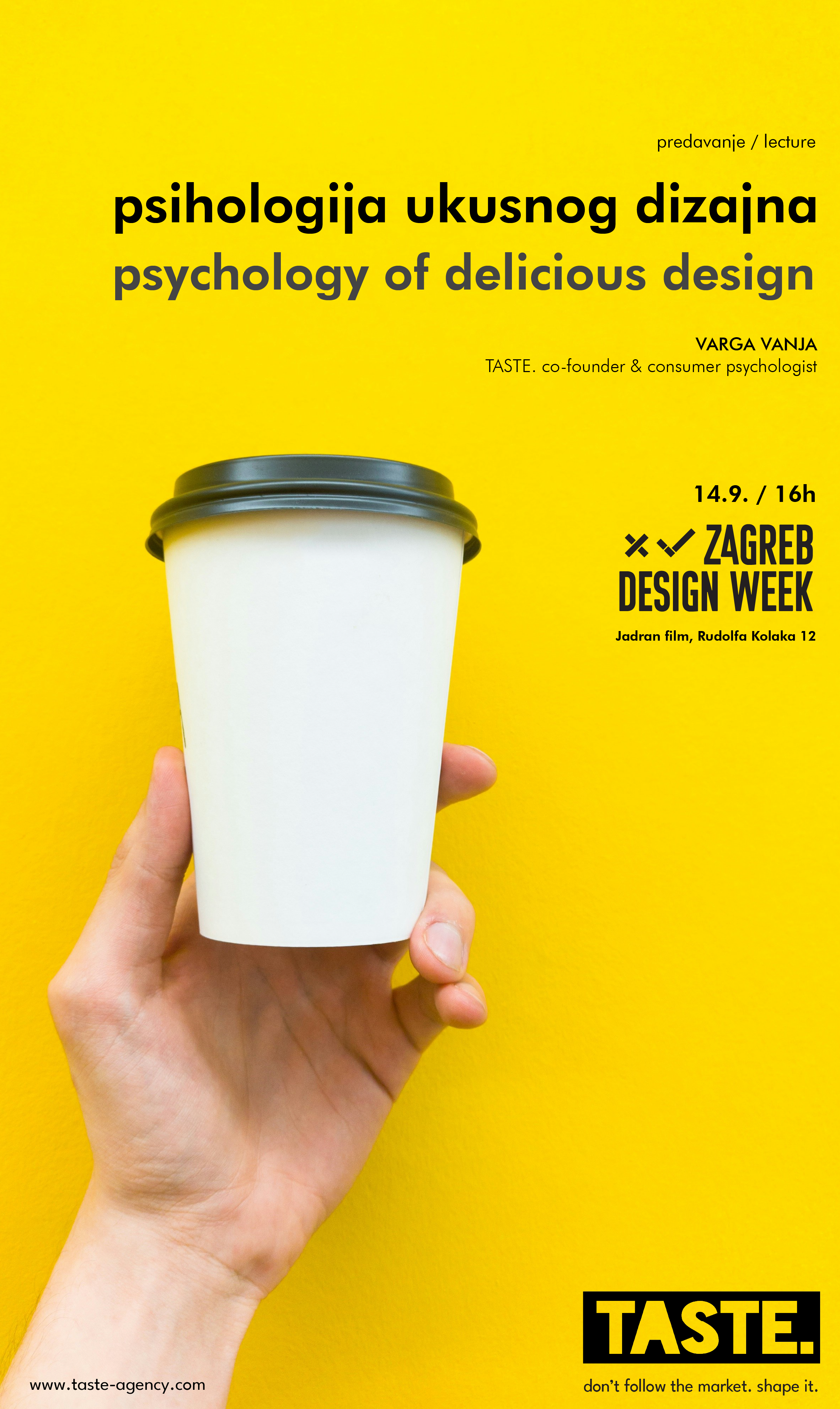 Predavanje ‘Psihologija ukusnog dizajna‘ koja će se održati 14.9. u 16 sati na Zagreb Design Weeku, otkriva kako dizajn i psihologija oblikuju način na koji doživljavamo prehrambene proizvode i usluge