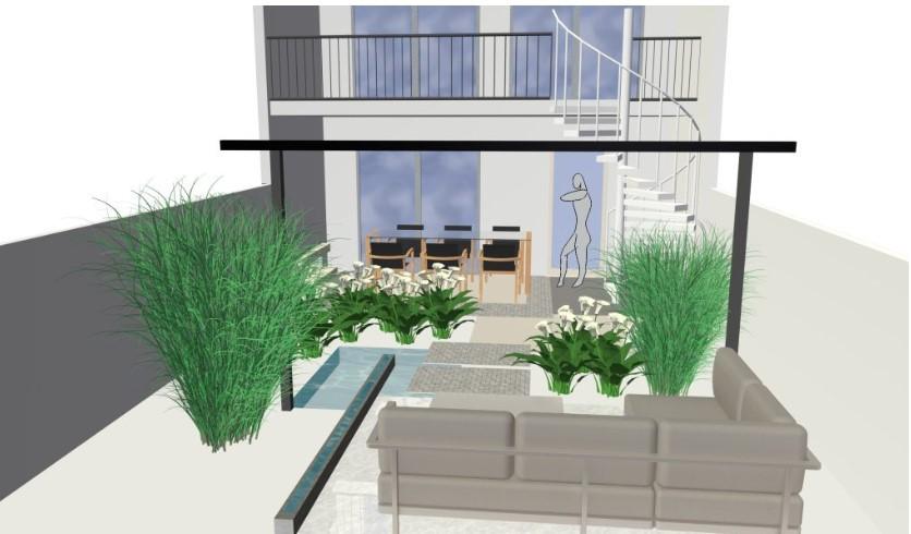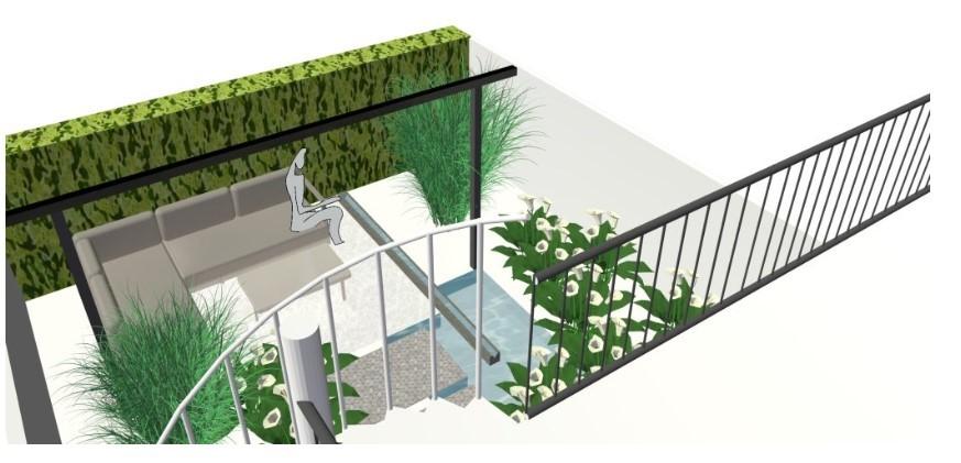 Jednostruka drvena pergola uokviruje prostor, a vrtni potok koji se ulijeva u središnje postavljeno, zrcalno jezerce unosi suptilan zvuk vode. Jezerce je bez bilja kako bi odražavalo oblake i time pružilo osjećaj prostranosti. Plan sadnje je prilagođen umjereno toploj klimi s blagim zimama, a uključuje pet biljaka. Prva je bijela kala (Zantedeschia aetiopica) koja se savršeno uklopila elegantnim i čistim linijama. Zatim su izabrane dvije ukrasne trave, crna mondo trava (Ophiopogon planiscapus ‘Nigrescens‘) i uspravni kultivar srebrnog kineskog šaša (Mischantus sinensis ‘Silberfeder‘). Ophiopogon unosi eleganciju crnim vlatima, dok Mischantus izdužuje prostor. Ugođaj upotpunjuje grmoliki bijeli pelin (Artemisia lactiflora). Kompoziciju zaokružuje živa zimzelena ograda portugalskog lovora (Prunus lusitanica) koja vrtu pruža privatnost. Korištenjem triju osnovnih vrtnih elemenata - terase, vodenog elementa i pergole - te dvjema vrstama popločenja i sadnjom pet biljaka postignut je vizualni sklad i stvoren funkcionalni te personalizirani mali gradski vrt. Vrt s jasnom temom uređenja i orijentiran na detalje, čime je postignuta i umjetnička kvaliteta.