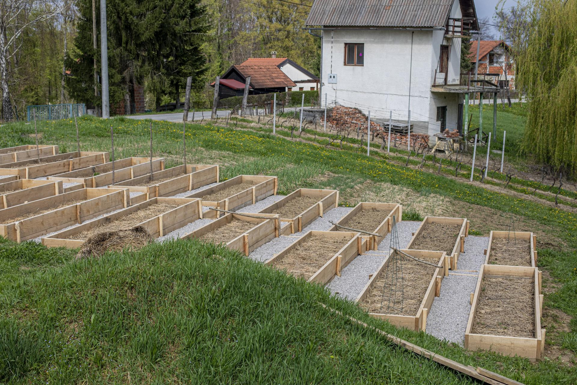 Ovog puta odlučila sam skratiti gredice s deset metara na dvije po četiri metra. Osim što je sada lakše obići i prijeći s jedne strane na drugu, prilagodila sam se i dostupnim materijalima – tavlonke su bile duge upravo četiri metra, što je smanjilo posao oko prilagodbe. A između gredica nastale su stepenice.