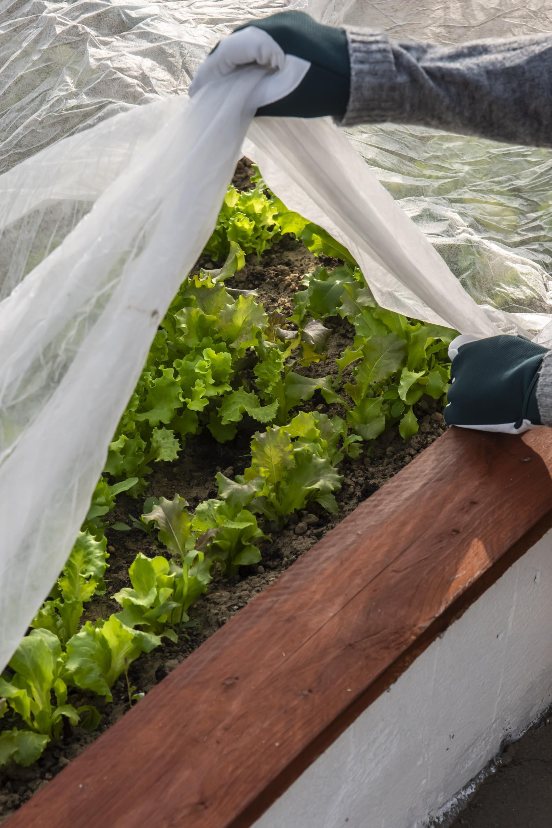 Kad temperature počnu oscilirati, biljke zaštitim agrotekstilom. Postavljen je preko lukova od fleksibilnih PVC cijevi, visine 80 cm. Agrotekstil propušta svjetlo, ali štiti od hladnoće, naglih promjena temperature, kiše i insekata. Tijekom ožujka i listopada spašava ranu salatu, rotkvice i endiviju.