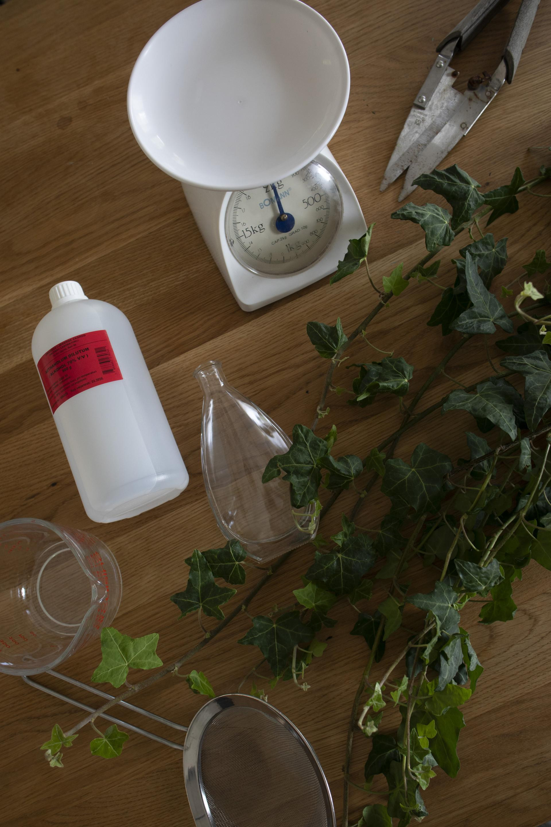 Potrebno je: nekoliko grana bršljana, 40%-tni alkohol, kuhinjska vaga, menzura, sito ili gaza, škare, posuda za natapanje i posuda za držanje tinkture.