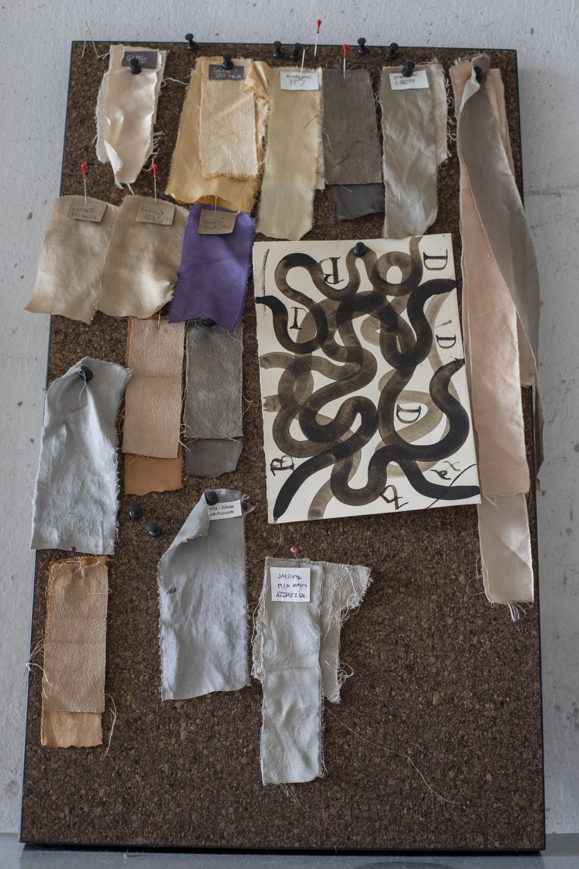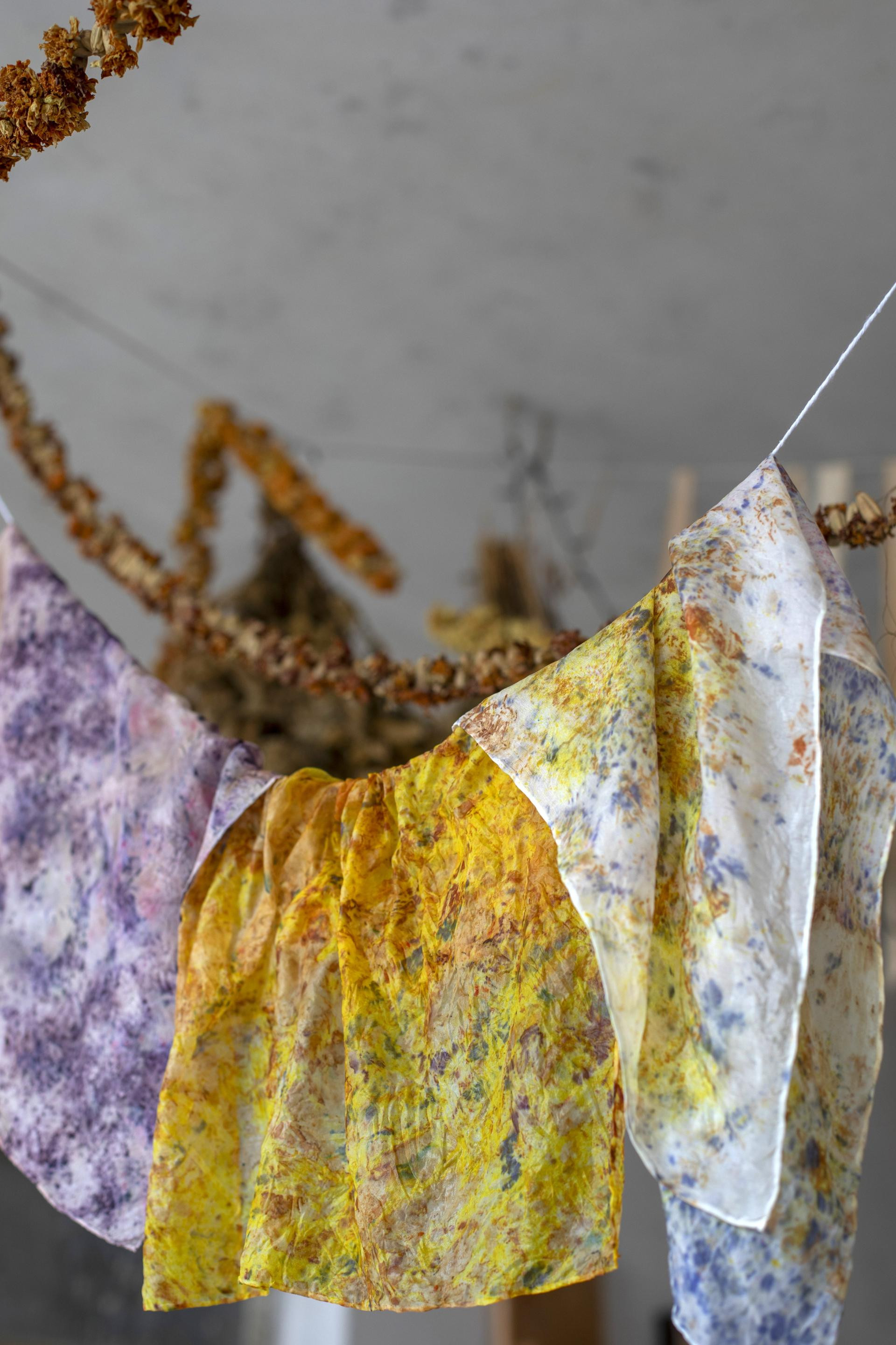 - Vrsta tkanine je ključna: pamuk, svila, lan, vuna, svaki materijal reagira drugačije na prirodna bojila. Vedrana najviše radi sa svilom i žuticom. Žutica je nebijeljena, neiskuhana tkanina platnenog veza, prepoznatljiva po žućkastoj boji i sitnim "mrljicama" od pamučnih sjemenki. Zahvalna je za bojadisanje jer bojila na njoj ostaju intenzivna, postojana i dugotrajna. Uz to, njezina proizvodnja zahtijeva znatno manje vode, što je čini ekološki prihvatljivijom. Prije bojadisanja, tkanina se pere na 60 °C kako bi se uklonile nečistoće i pripremila površina za vezanje bojila.