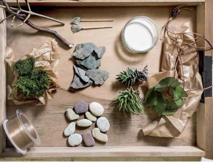 Posuda u koju ćemo složiti naš zen vrt, folija,vata, nekoliko lučica, mali sukulenti, kamenje, suhe grančice, javanska mahovina, vodeni lopoč, fini bijeli pijesak, dno razbijenog lončića, i flaks (onaj koji se upotrebljava za ribolov).